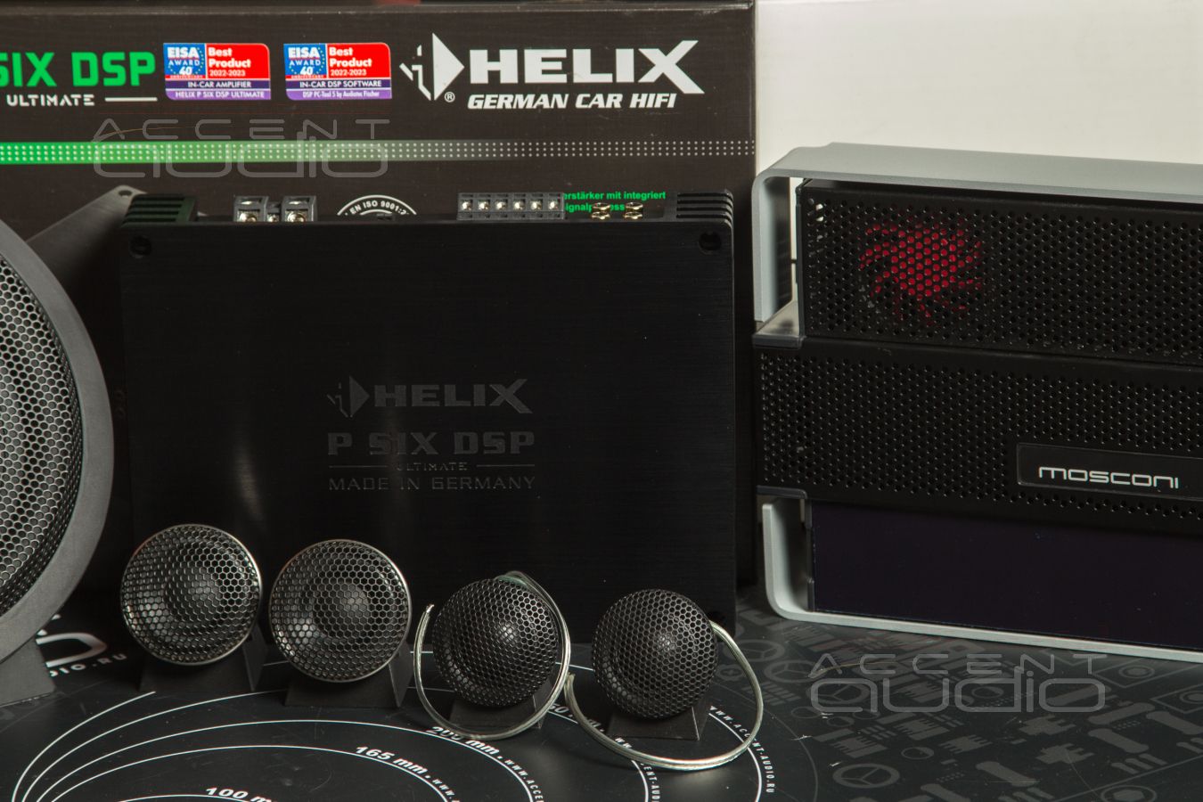 Mosconi PRO 4\10 стоит внизу, а выше, через зазор в 2 см – уже Helix PSix Ultimate.