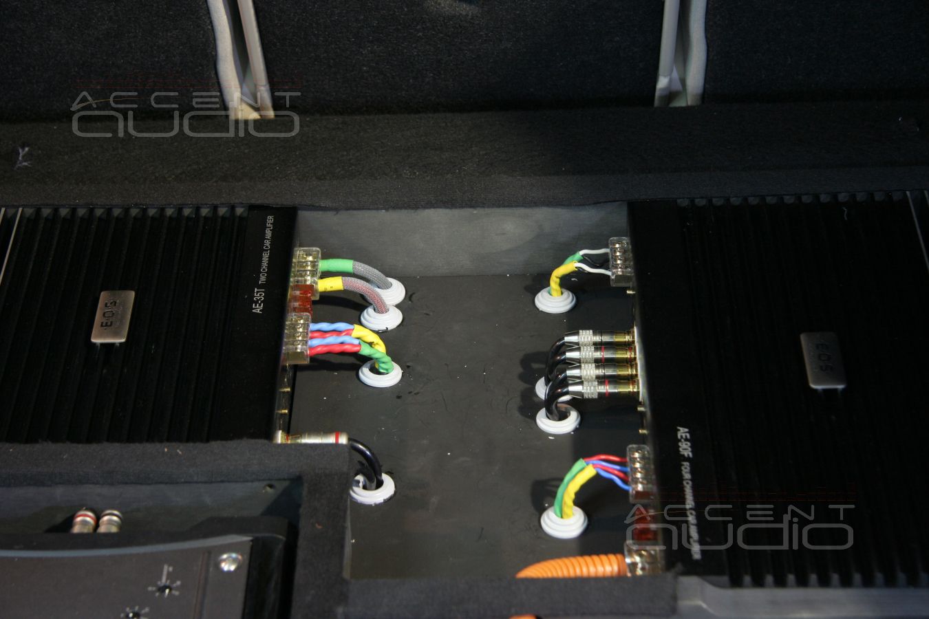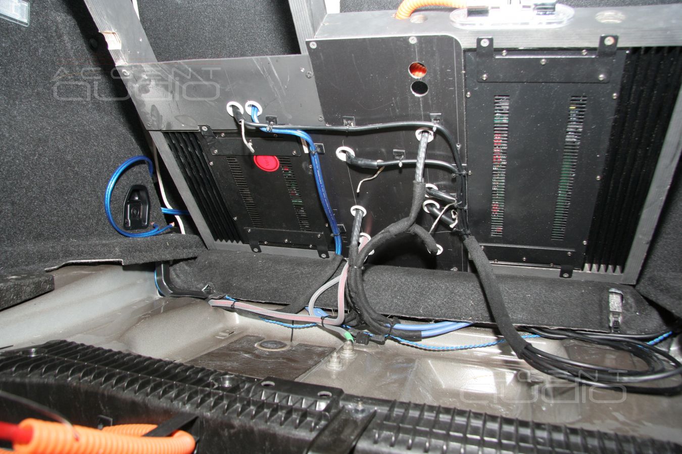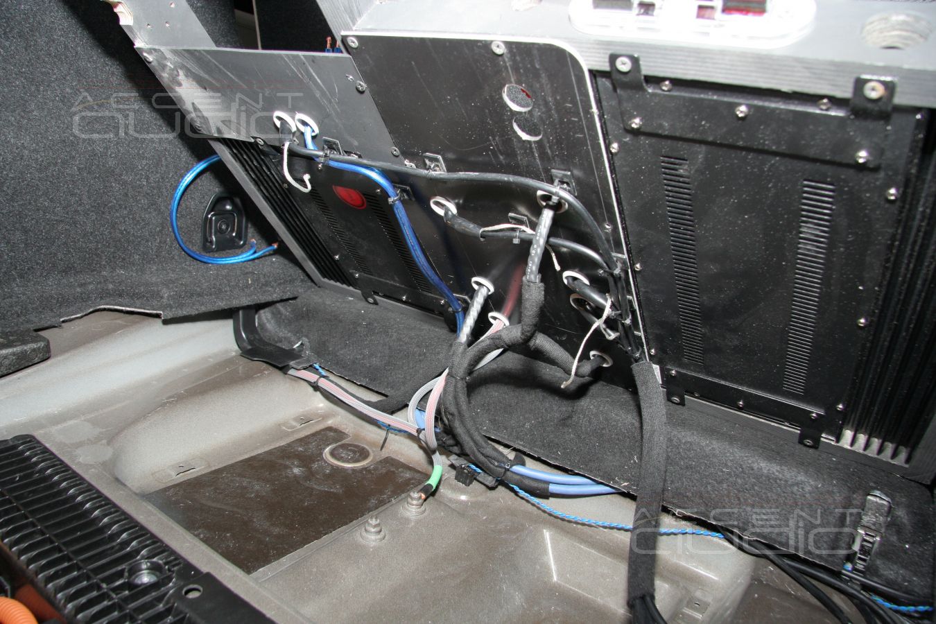 Тут тоже ничего нельзя резать, менять и т.п. Поэтому штатное пластиковое корытце из багажника передано заказчику для хранения в гараже, изготовлен новый каркас для размещения усилителей, а роль основного пола выполняет... штатный основной пол.