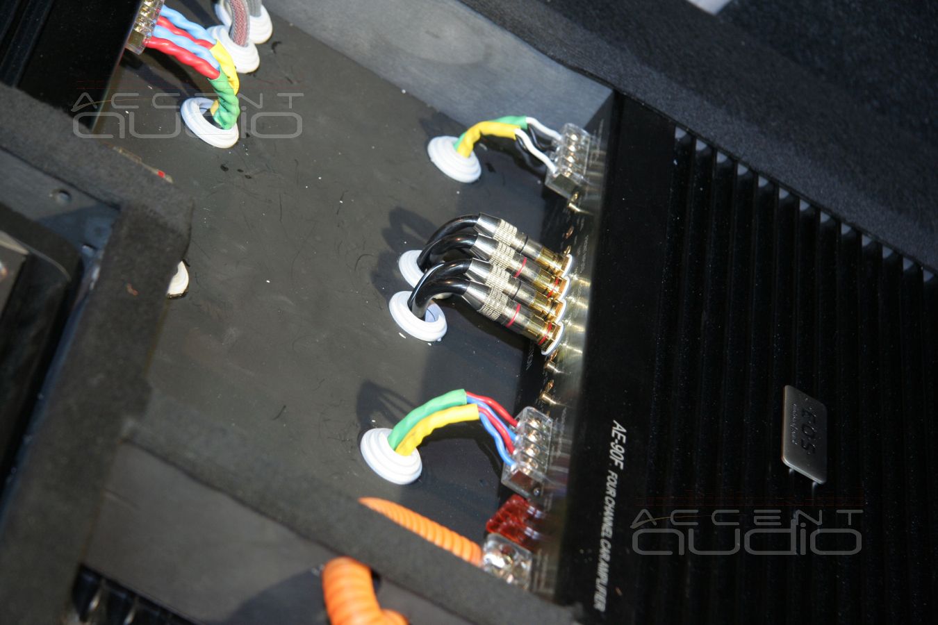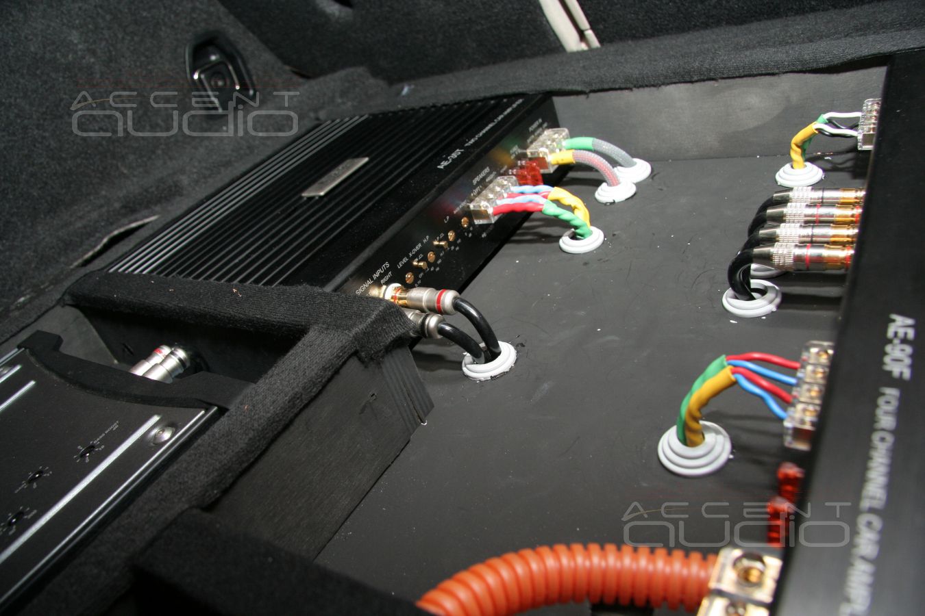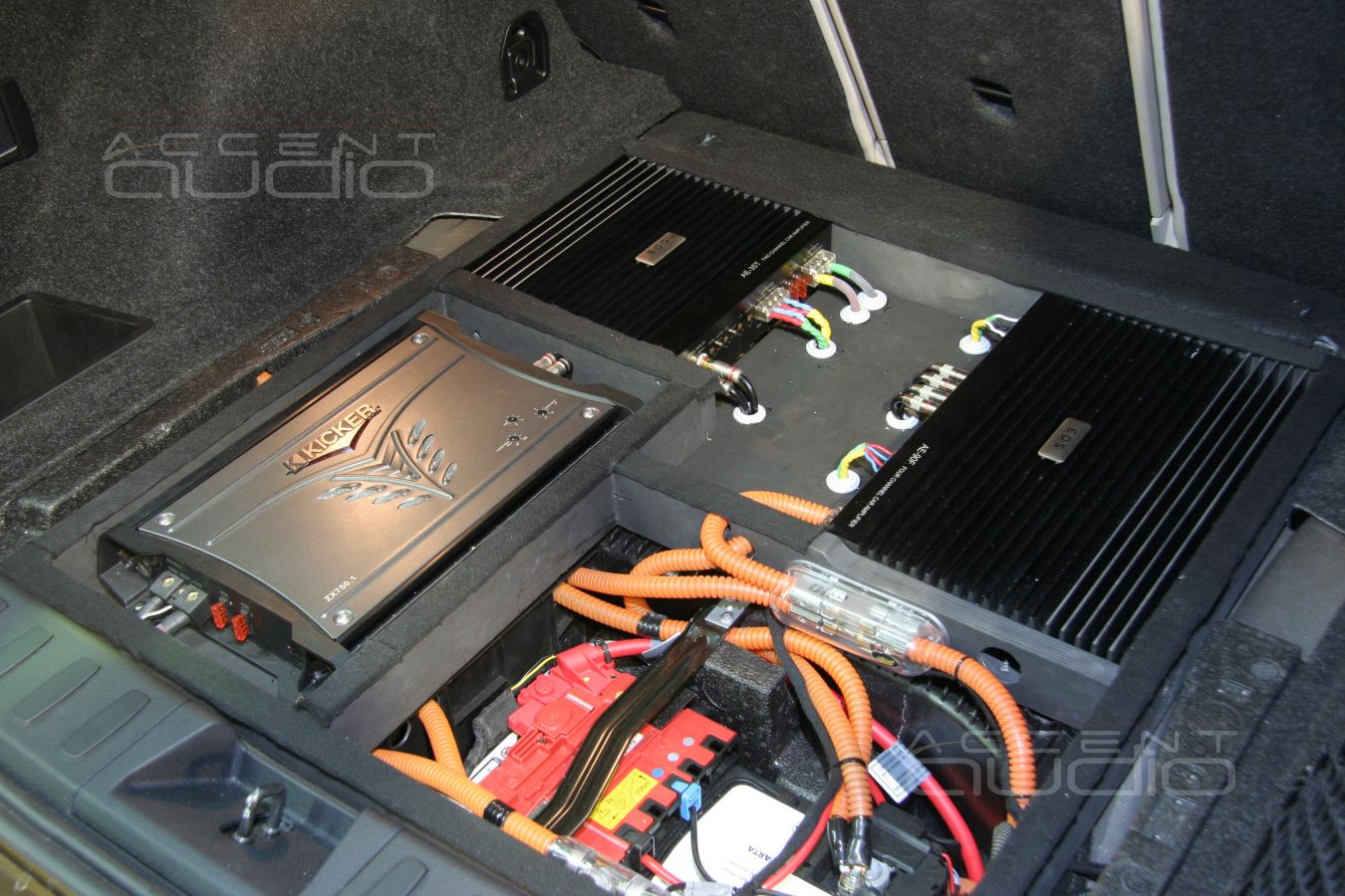 Тут тоже ничего нельзя резать, менять и т.п. Поэтому штатное пластиковое корытце из багажника передано заказчику для хранения в гараже, изготовлен новый каркас для размещения усилителей, а роль основного пола выполняет... штатный основной пол.