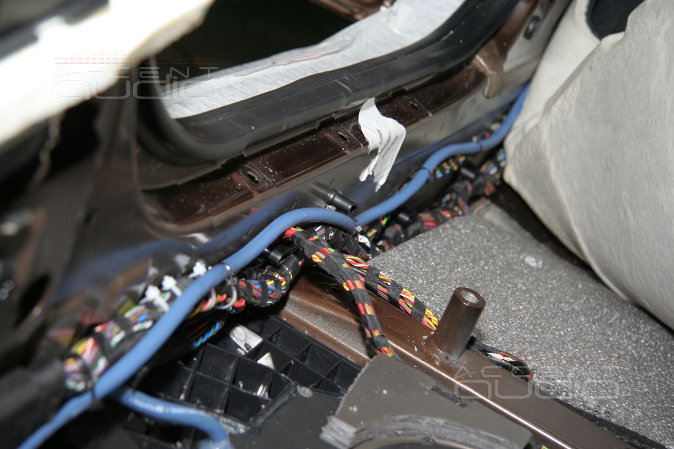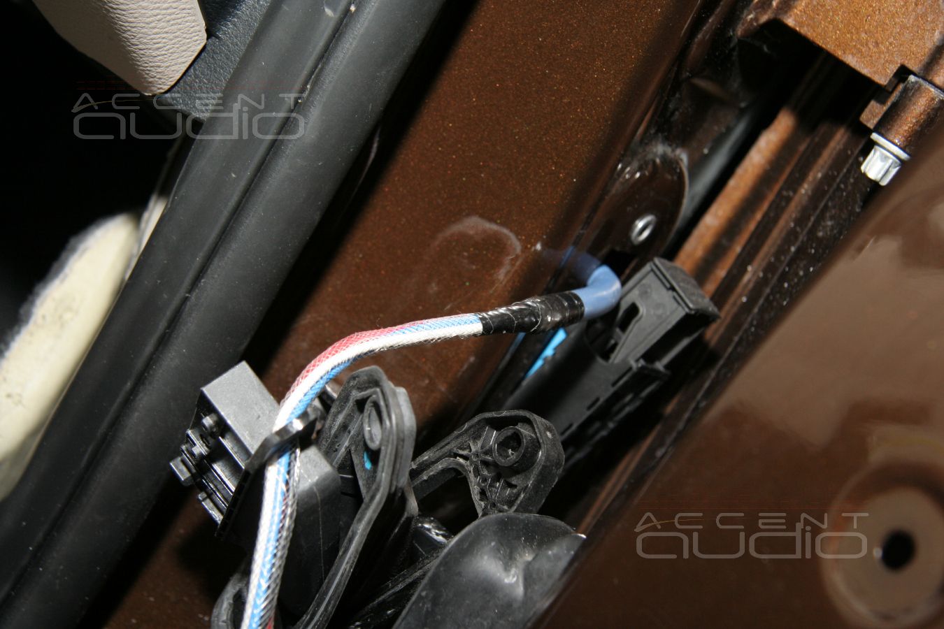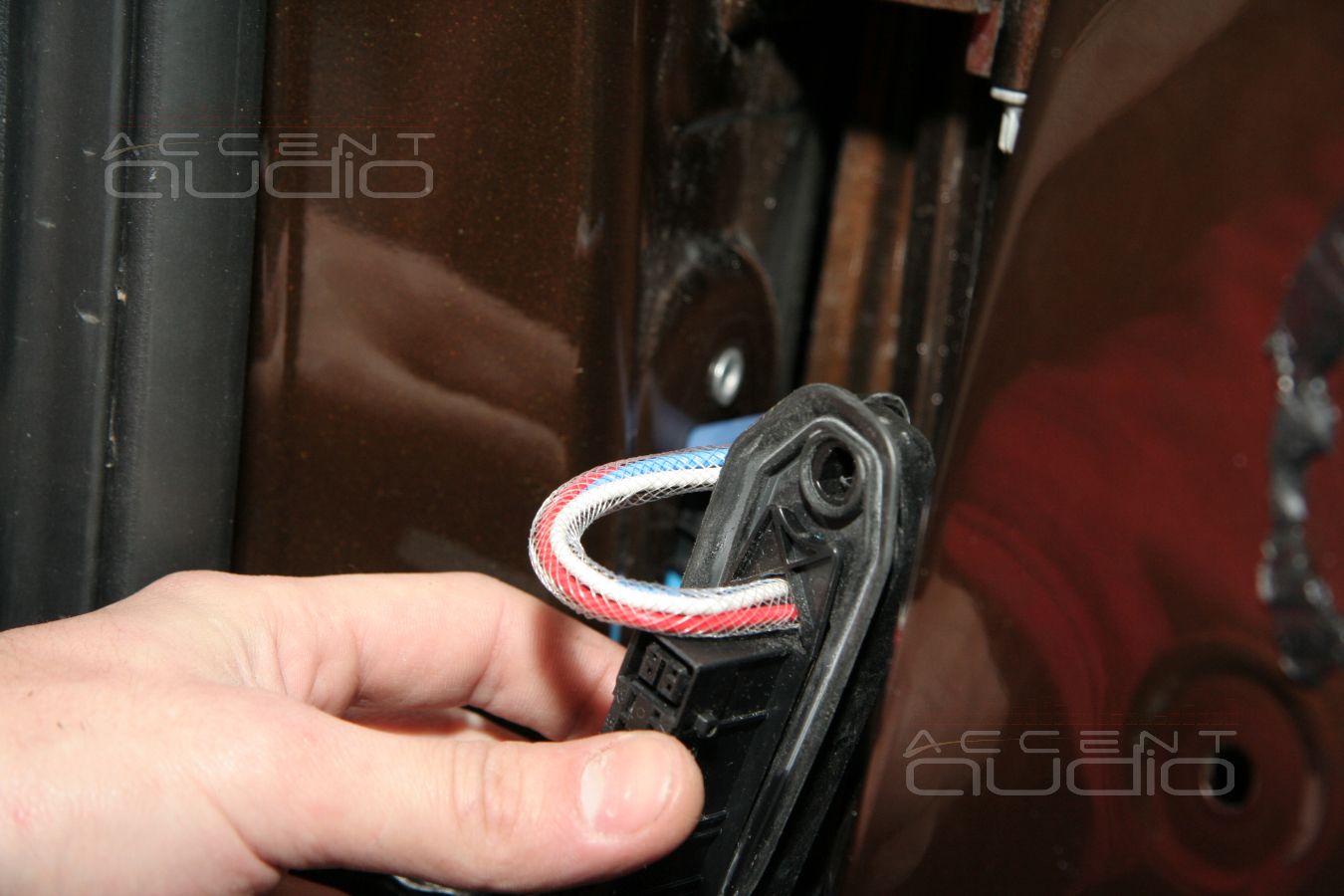 Очень просто. Все провода уложены так, что ни одно крепление не пострадало, проход в двери осуществлен через штатные гофры в обход штатных разъемов, ничего сверлить не пришлось, просто применены некоторые хитрости.