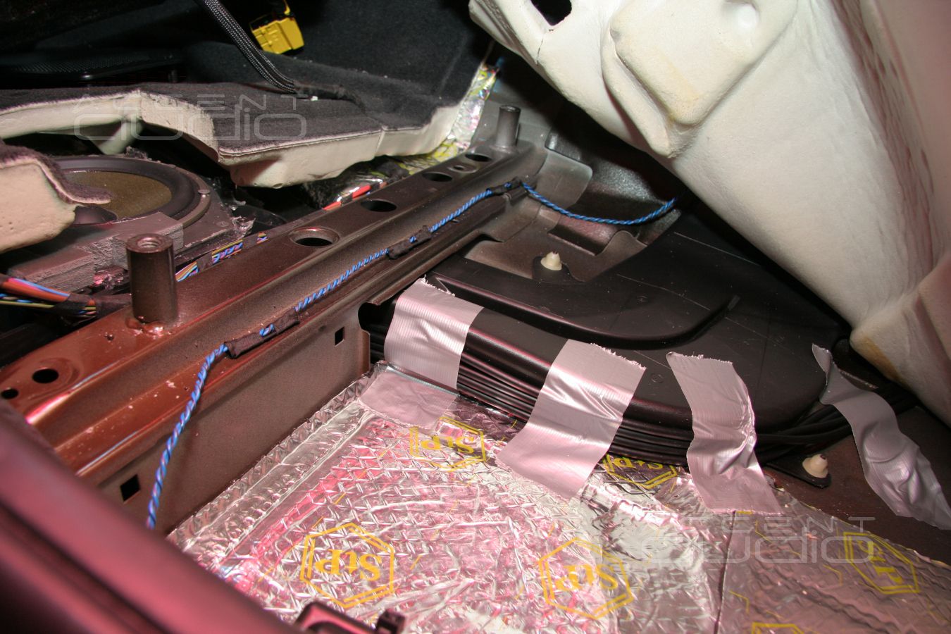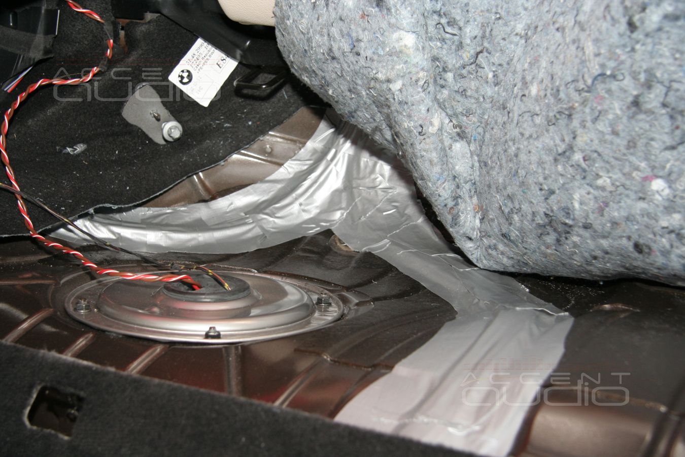 Штатное место для мидбсаов в BMW X1 - тяжелые пластиковые корытца, установленные под сидушками и передающие мидбасам ОБЪЕМ ПОРОГОВ автомобиля, т.к. сами корытца имеют герметичный и жесткий отвод в пространство порога. Решение очень интересное, безусловно, при наличии среднечастотных динамиков и таких средств настройки, которые позволят "не понимать, где установлен мидбас", т.е. не локализовывать звучание излучателей, установленных под сидениями.