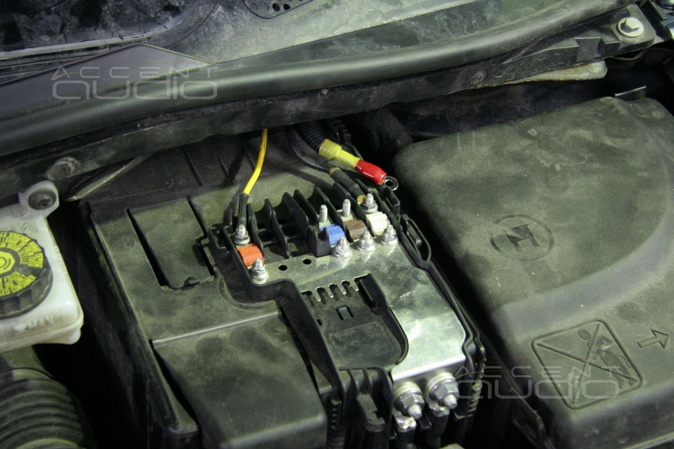 Кстати еще один маленький, но приятный европейский сюрприз ждал нас под капотом. Обычно, при прокладке силового кабеля к усилителю, под капотом приходится ставить колбу с предохранителем. В Citroen C4 все иначе: на АКБ закреплена силовая шина с предохранителями, к которой подключены и питаются все бортовые потребители. На шине существует два резервных предохранителя. как будто французы предполагали, что захочется еще что-нибудь запитать, и решили угодить тому, кто будет работать с их детищем.