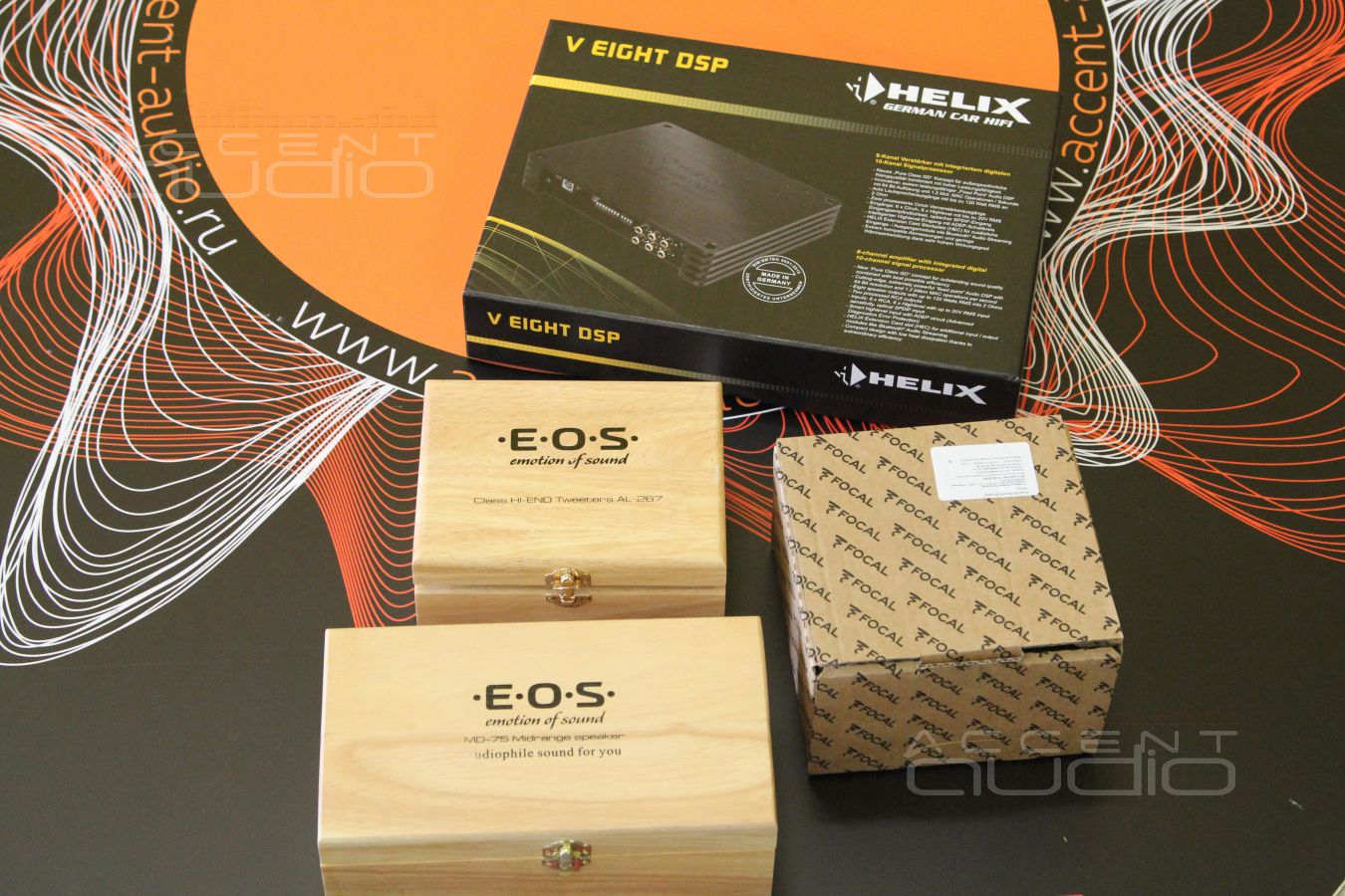 Напомним, как используются восемь каналов Helix Veight: пара каналов обслуживает твитеры E.O.S AL-267, пара – на среднечастотники MD-75, пара качает мидбасы Focal MW PS165F3 и последние два работают с тыловой акусикой Focal PC165F (машина большая, семейная, тыловая акустика реально нужна).