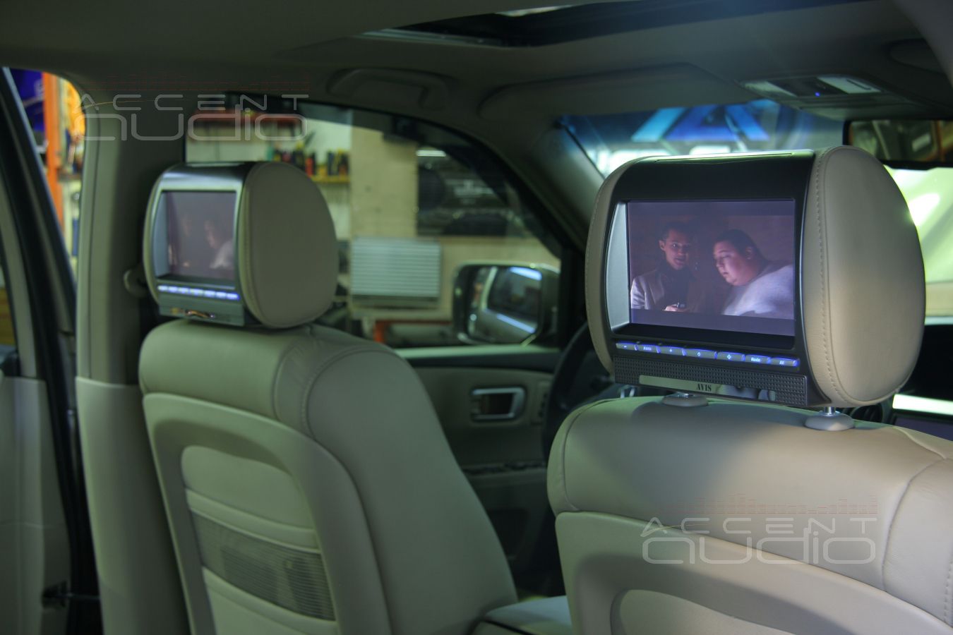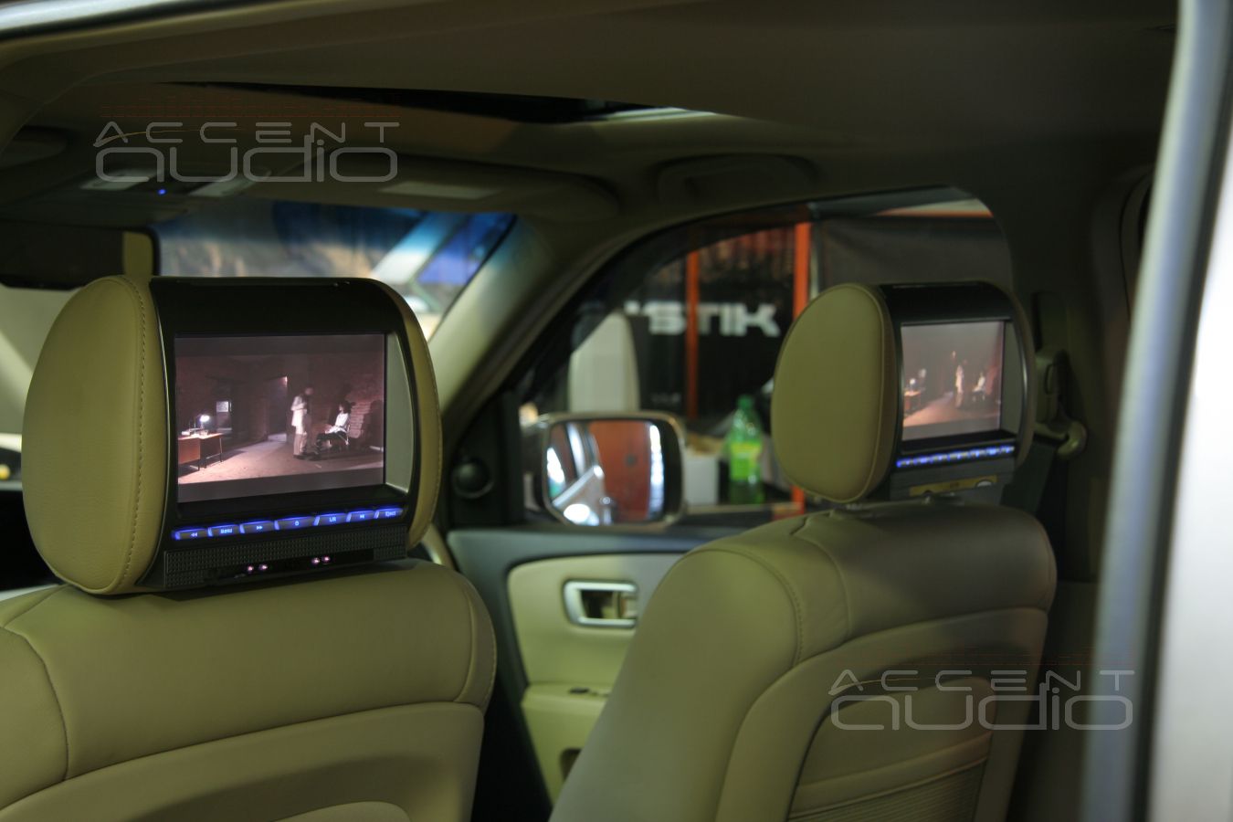 - Мониторы в подголовниках - решение на любителя, но тем не менее удобная и функциональная альтернатива PSP для развлечения детей и пассажиров. Естественно на мониторы транслируется изображение с головного устройства, а при необходимости можно разделить звуковое и видео пространства салона на две зоны.