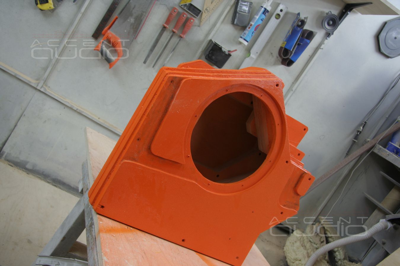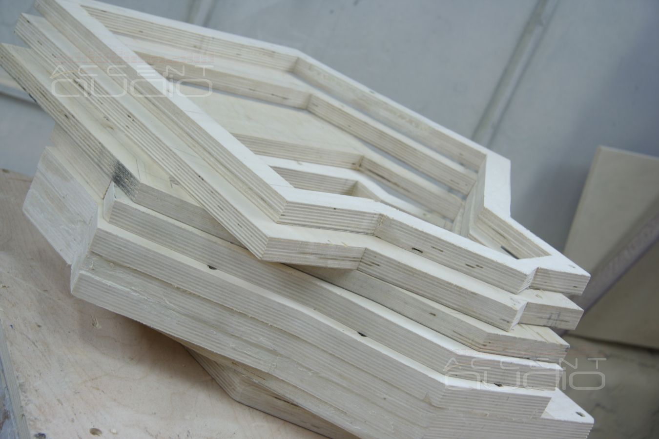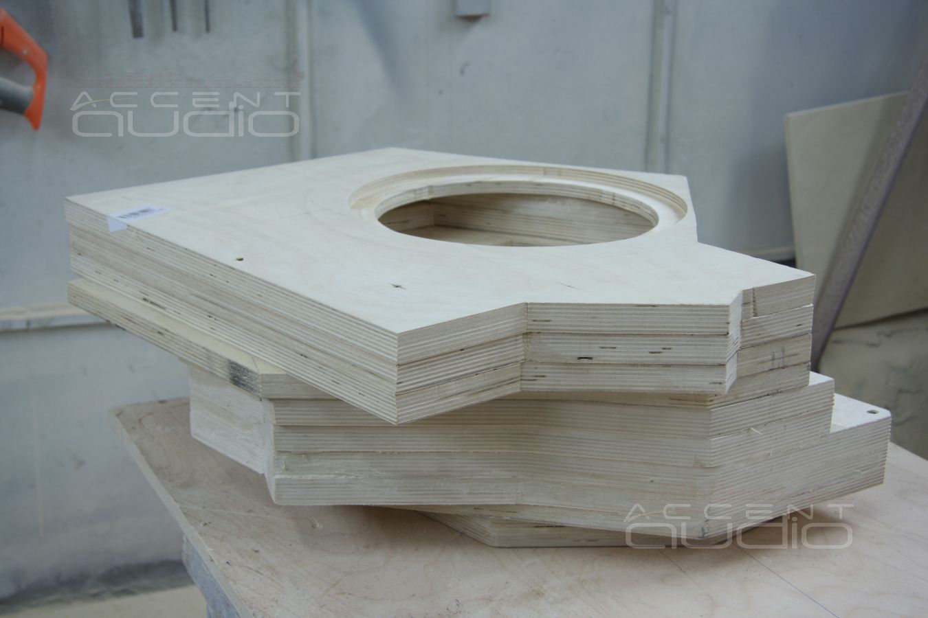 Сабвуфер, как всегда - отдельная история. В этот раз мы решили изготовить стелс по самой аудиофильской технологии - с многослойными стенками. При тройном расходе материала, ящик проще строить, а в итоге он имеет максимальную жесткость и прочность. Полученный объем - 14,5 литров.