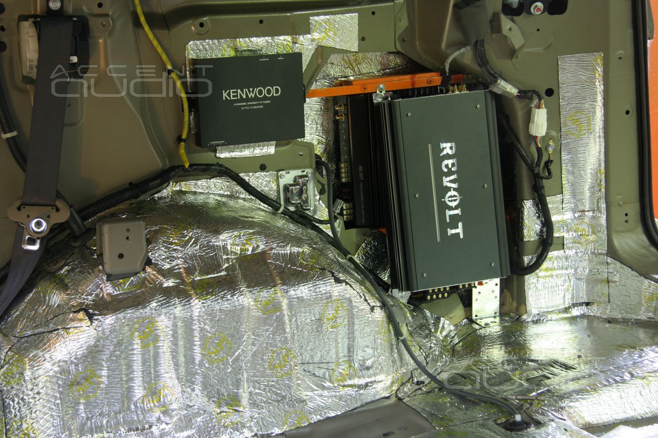 Переходим в багажный отсек. Штатный сабвуфер уступил место двум усилителям. Штатная сетка как нельзя кстати находится именно в том месте, где хорошо было бы добавить немного прохладного воздуха для дыхания усилителей. Американский Revolt RS 200.4 работает с фронтальной и тыловой акустикой, а сабвуфер будет раскачивать E.O.S. AE 35T LE V2. Оба усилителя - устройства высочайшего качества сборки и звучания, обладают запасами мощности и невысокой стоимостью.