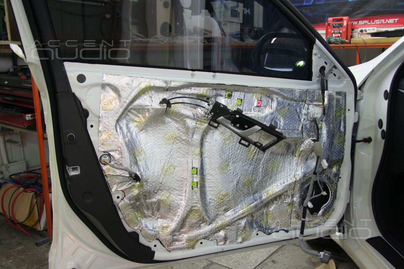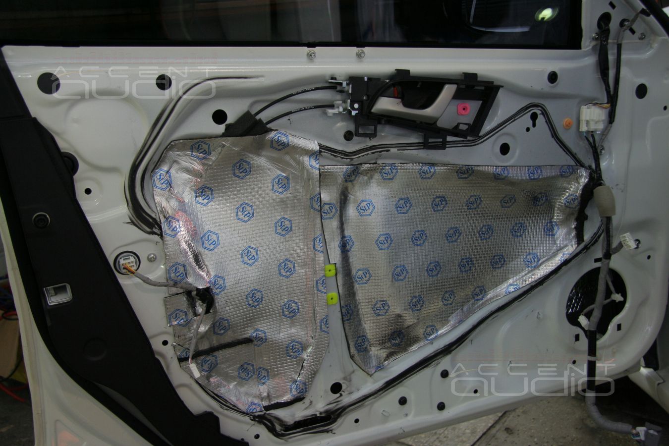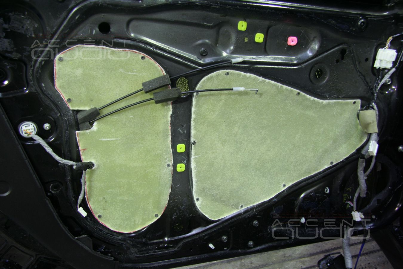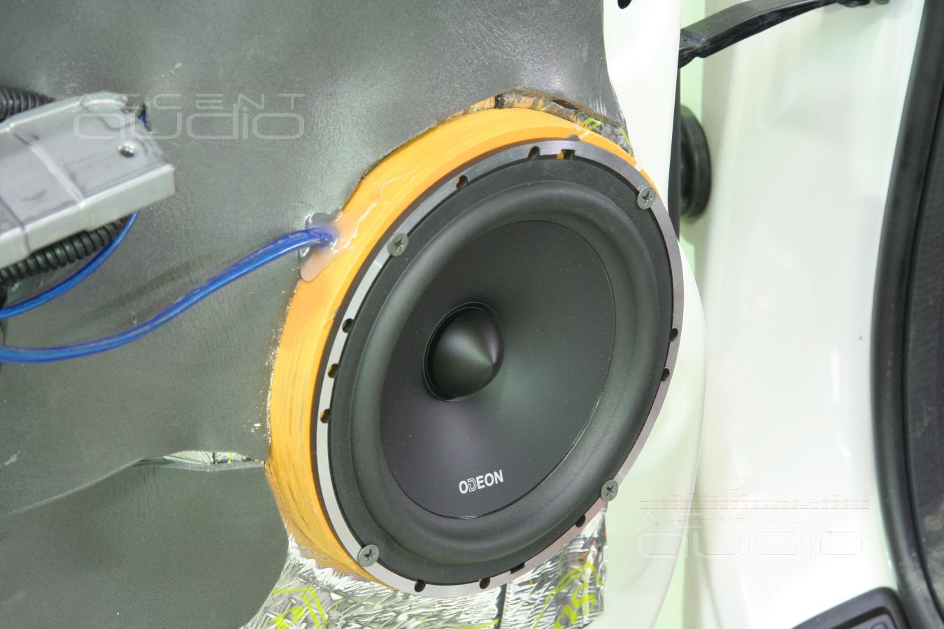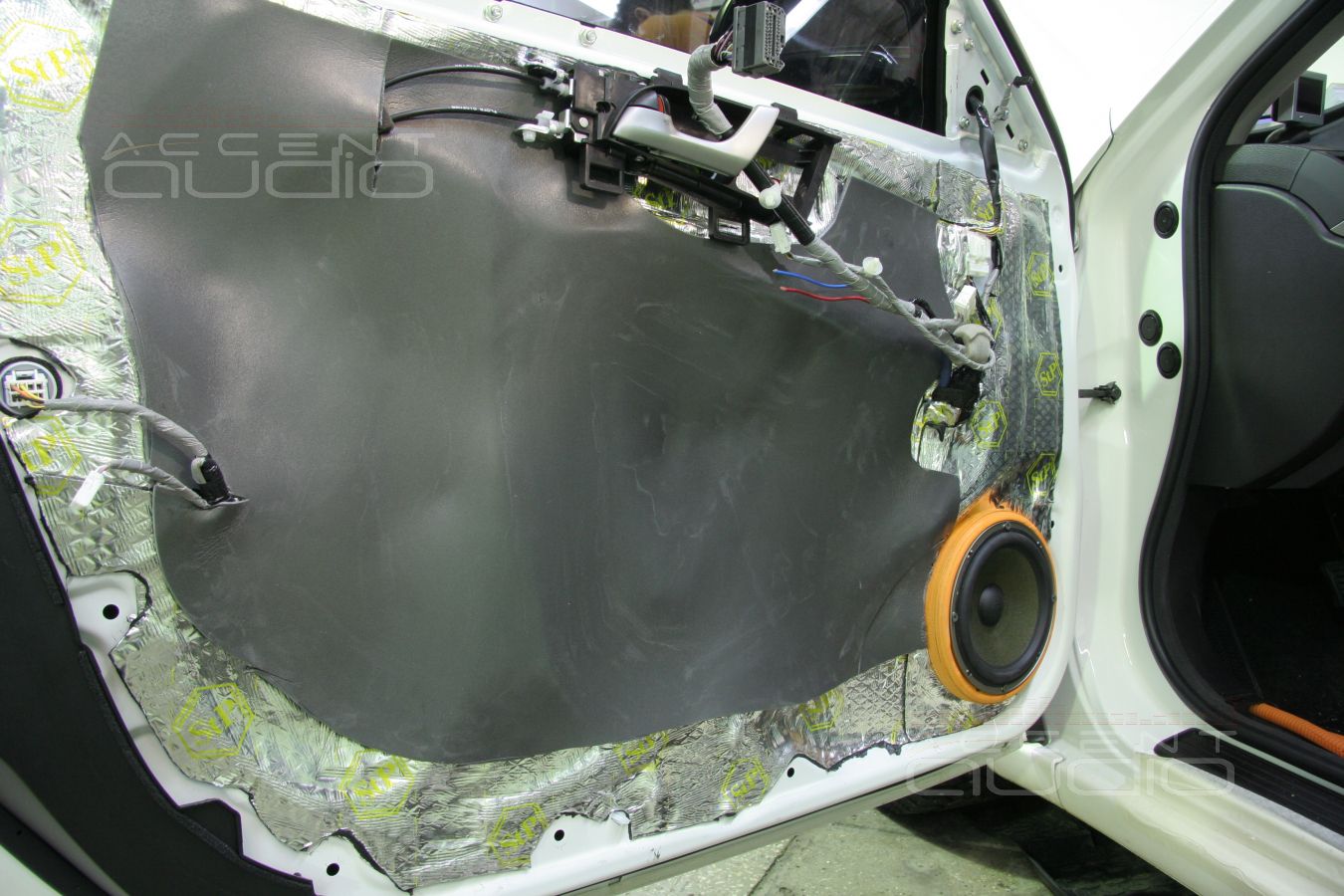 В обеих машинах двери под акустику готовились по-полной. В случае с черным Аккордом дополнительно к пяти слоям вибродемпфера использовались стеклматы, в случае с белой машиной - визоматы STP.