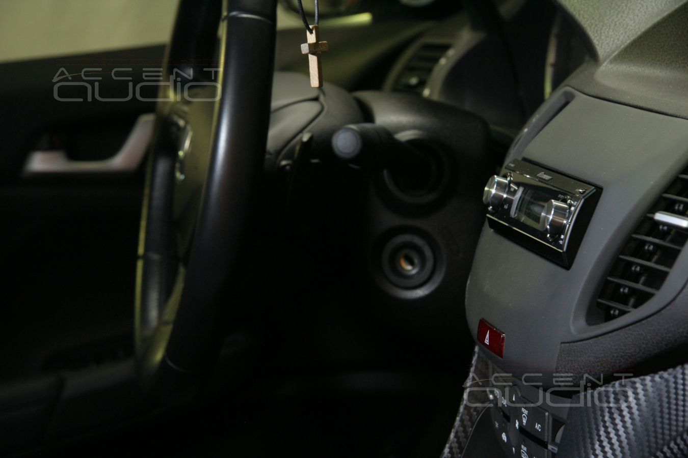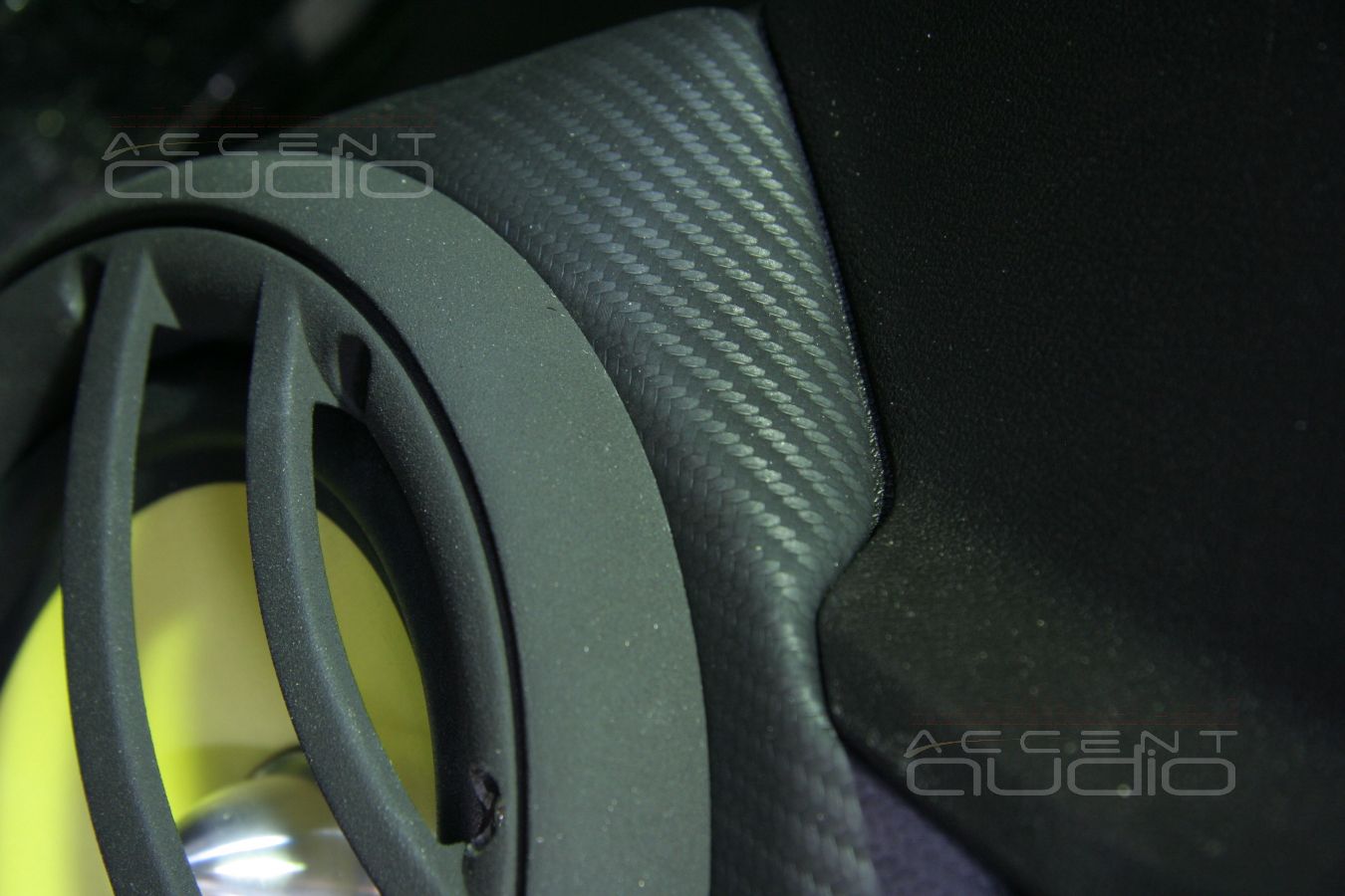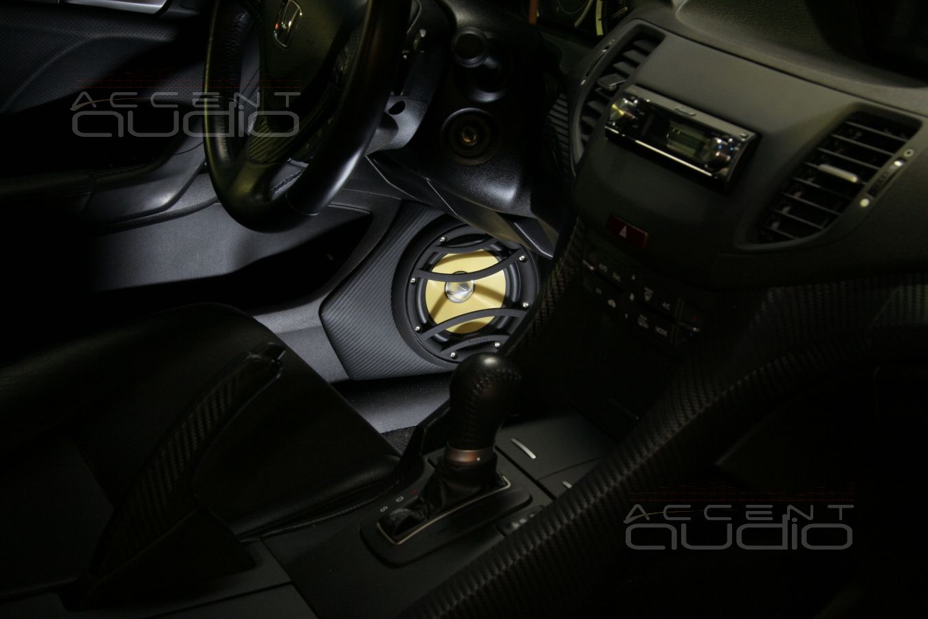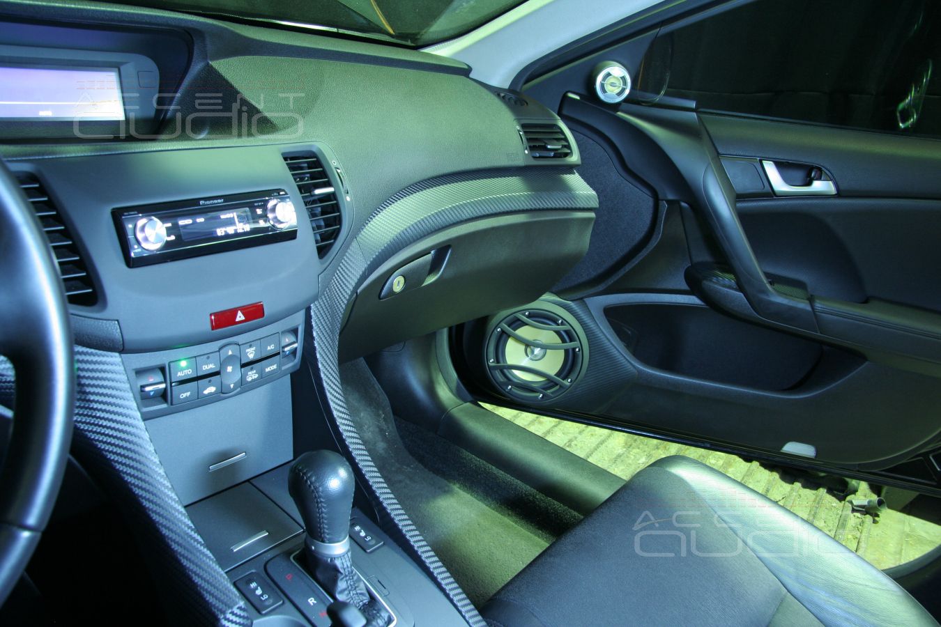 Владелец черного Аккорда уже перетянул некоторые детали инстерьера своего авто в карбон и мы предложили решение по установке, полностью соответствующее и интерьеру и настроению заказчика: подиумы под мидбасы вынеснены за обшивки и перетянуты в немецкую кожу, выделанную под карбон. Достоинстав такого решения не только в идеальном расположении мидбасов, отменная эстетика такой установки еще и крайне долговечна, потому что натуральную кожу крайне трудно поцарапать, испачкать, повредить носком ботинка и т.п.