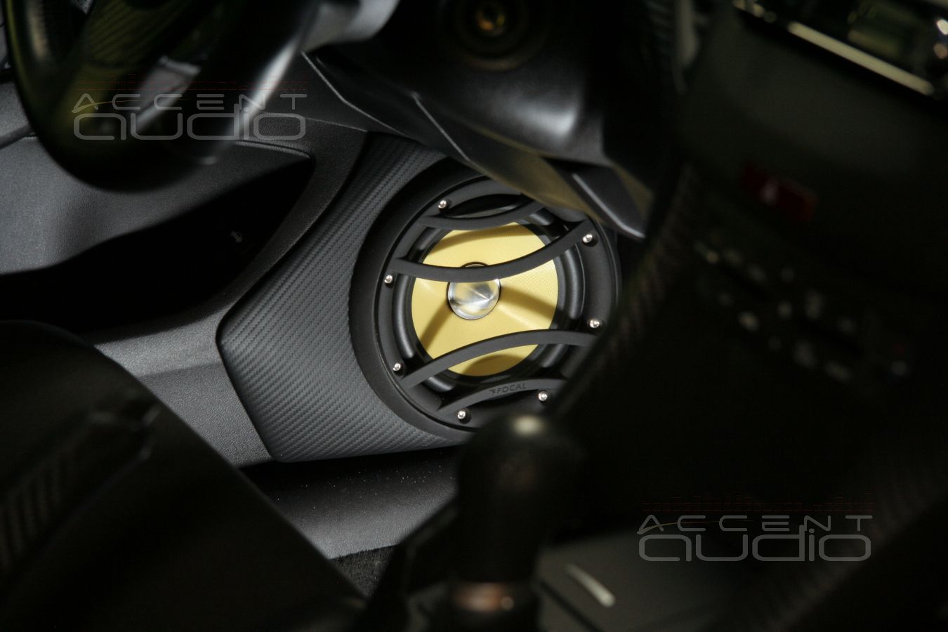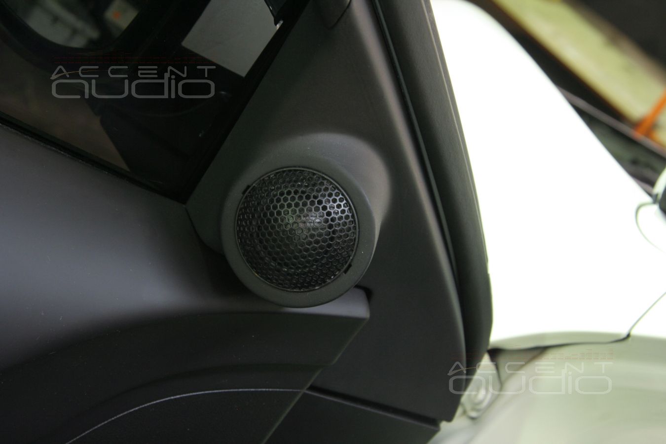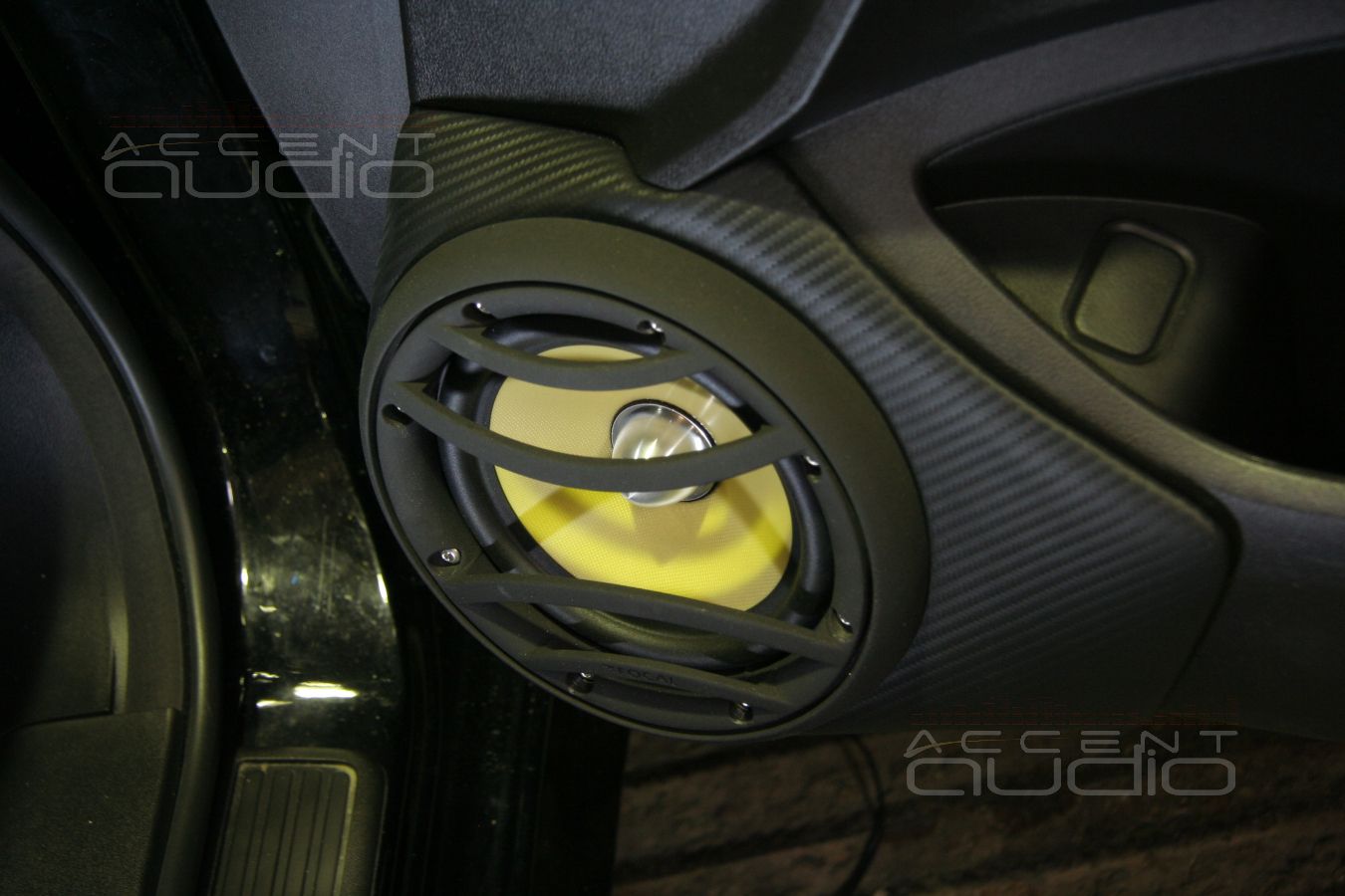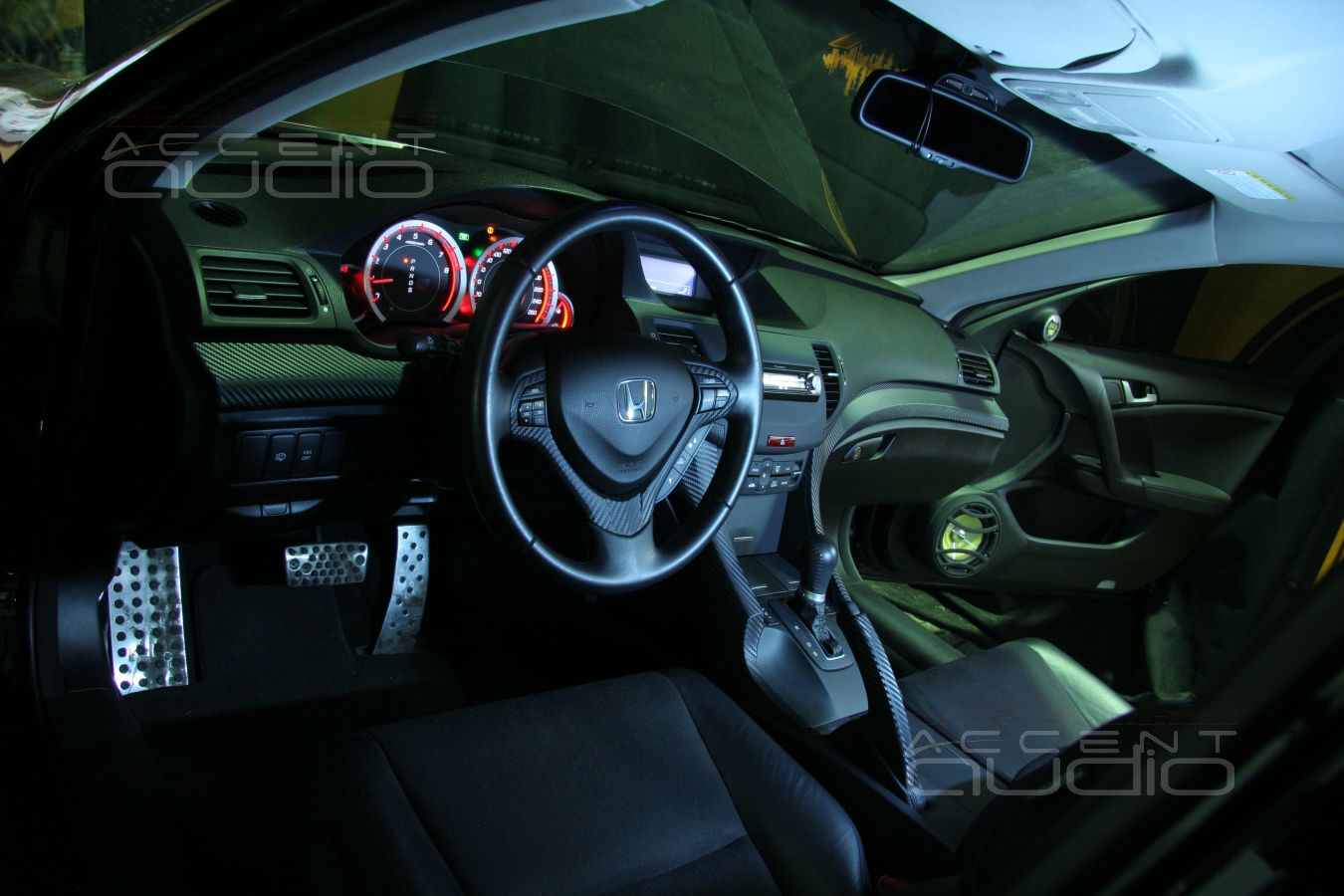 Владелец черного Аккорда уже перетянул некоторые детали инстерьера своего авто в карбон и мы предложили решение по установке, полностью соответствующее и интерьеру и настроению заказчика: подиумы под мидбасы вынеснены за обшивки и перетянуты в немецкую кожу, выделанную под карбон. Достоинстав такого решения не только в идеальном расположении мидбасов, отменная эстетика такой установки еще и крайне долговечна, потому что натуральную кожу крайне трудно поцарапать, испачкать, повредить носком ботинка и т.п.