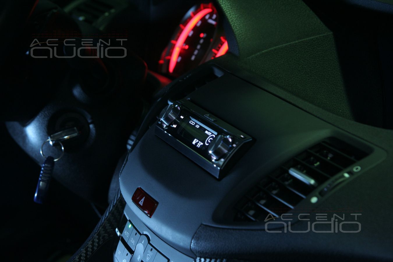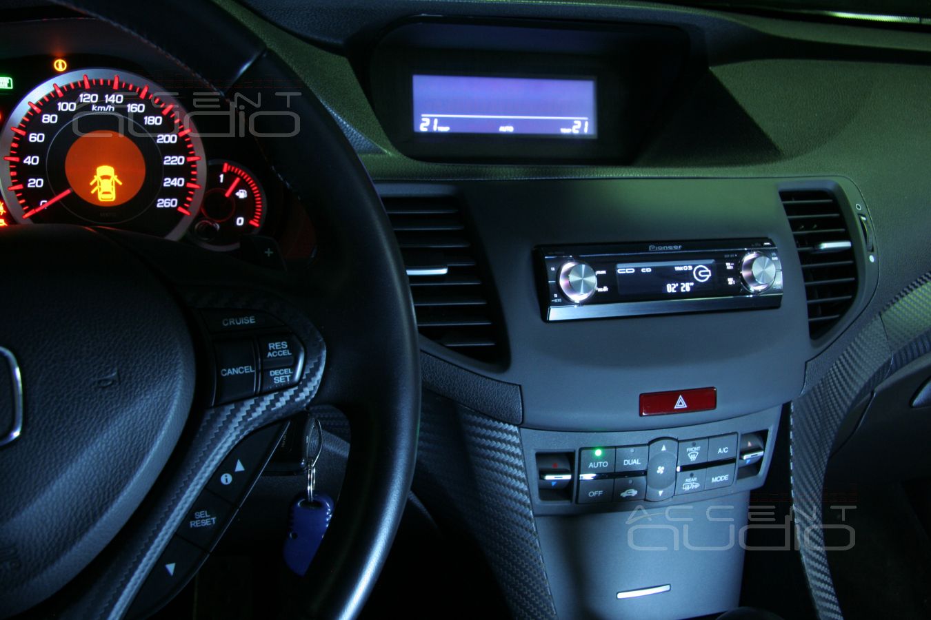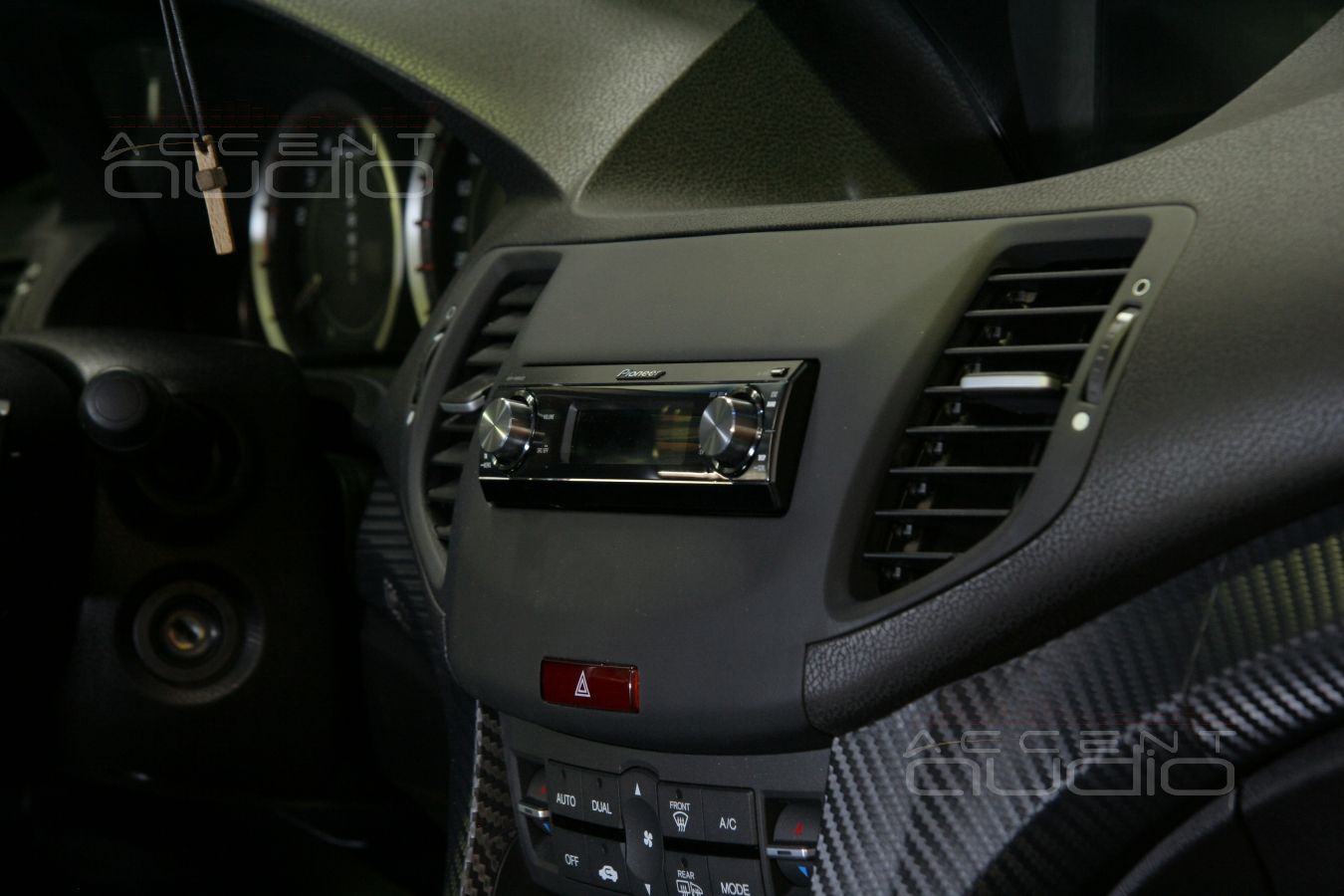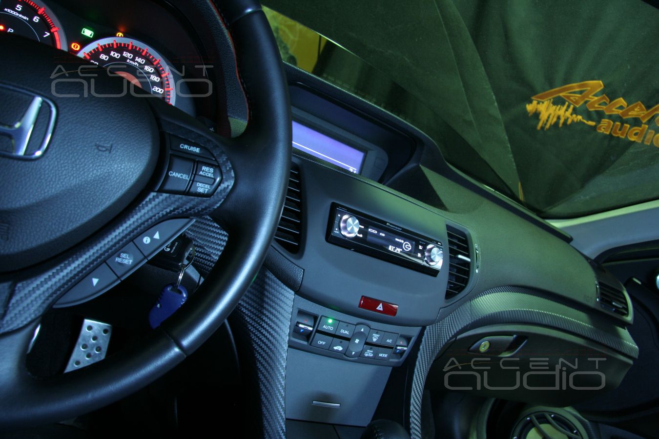 - Установка процессорной магнитолы Pioneer DEH-P88RSII в черный Honda Accord более лаконична, но не менее оригинальна. Если взамен штатной магнитолы устанавливается новая, мы должны изготовить переходную рамку. Как она должна выглядеть - вопрос к непосредственному заказчику и тут черный аккорд стал против нас: "Хочу, чтобы рамка была похожа на торпедо. Плоская, пустая с плавными переходами, брутально и по-космически просто."