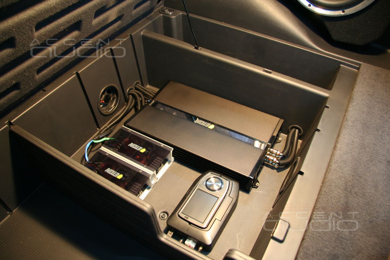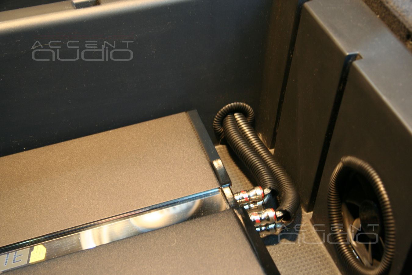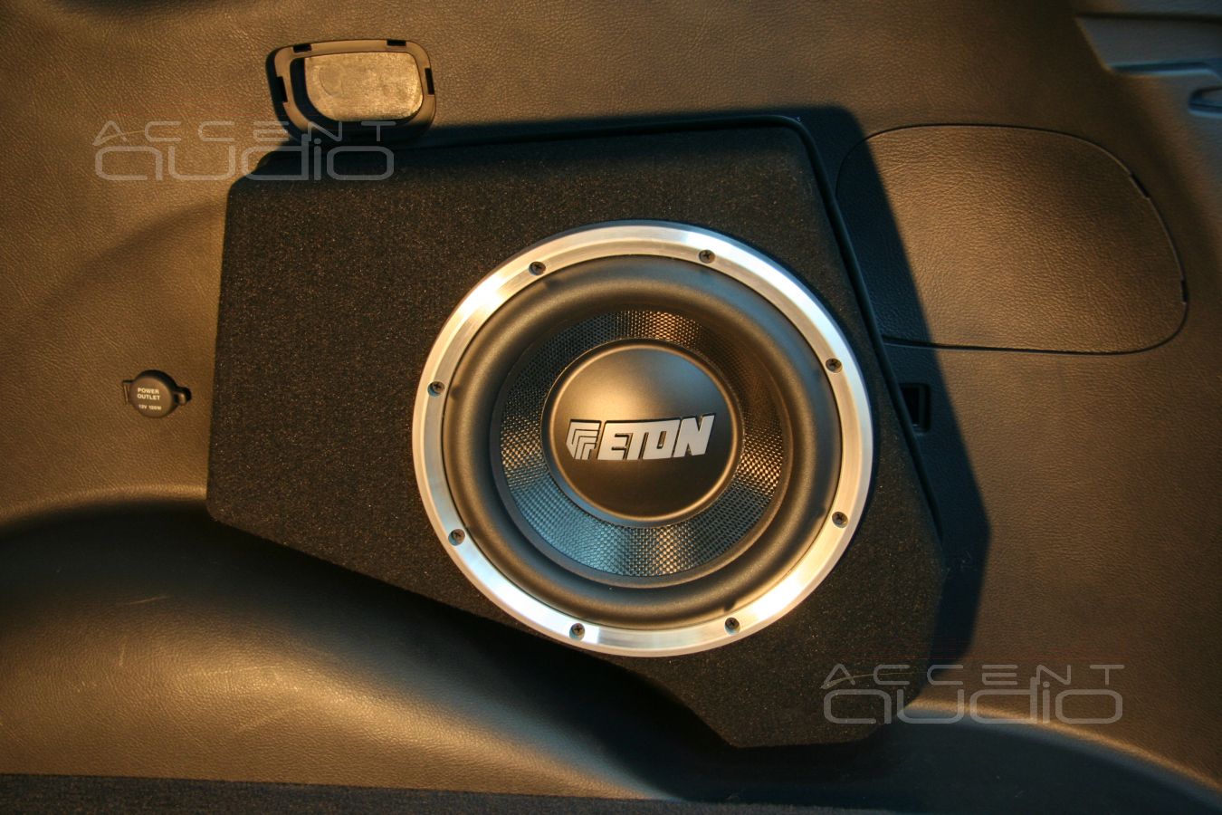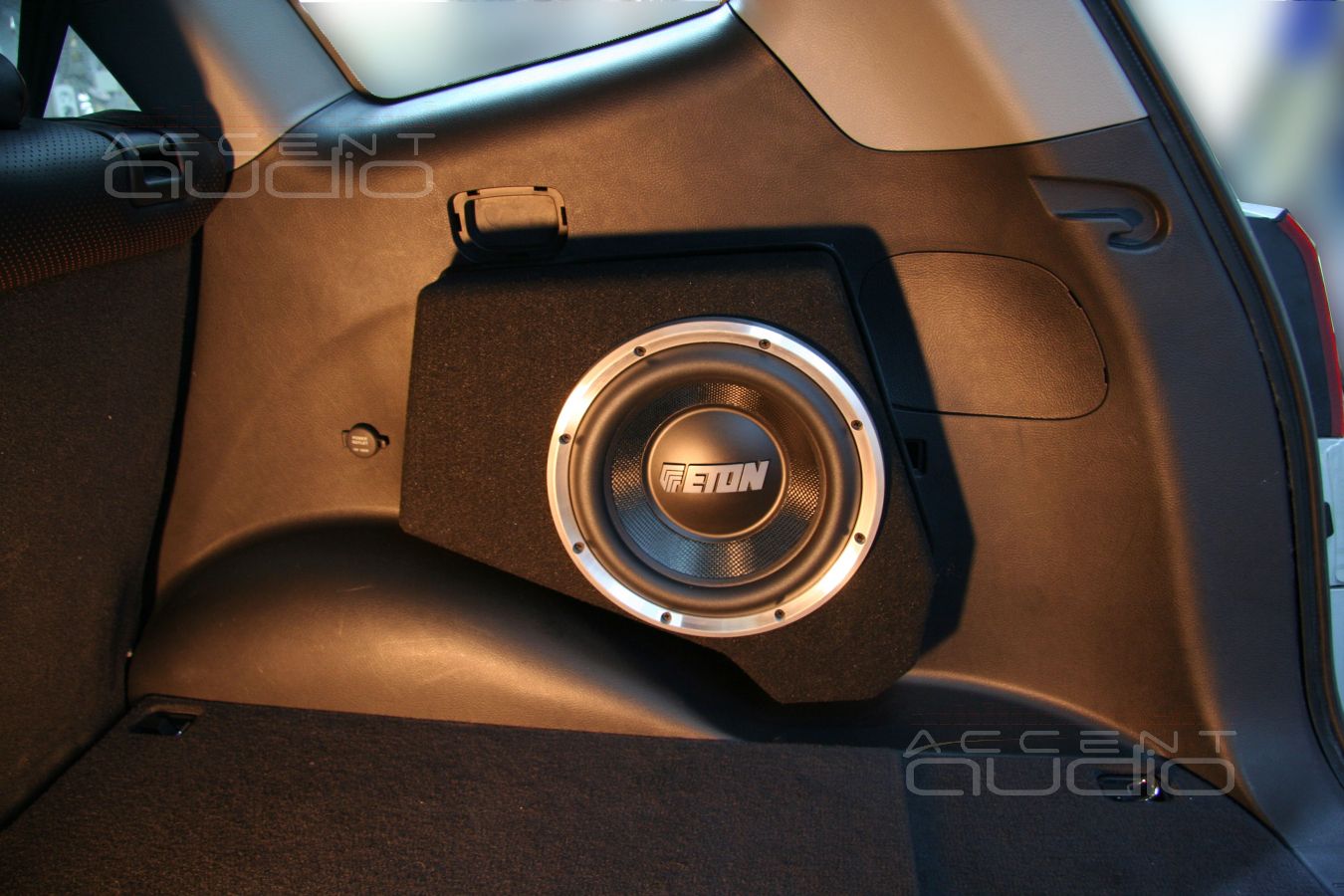 - Сабвуфер. Так как багажник автомобиля используется заказчиком максимольно, сабвуфер решили оформить в виде «стелса» в правом крыле. Головка подобрана в соответствии с требованиями заказчика и нашим представлением о звучании будущей системы в целом. Это Eton EC 10-800, который может работать в очень маленьких объемах, что, в свою очередь, позволяет максимально «утопить» сабвуфер в неиспользуемую часть багажника.