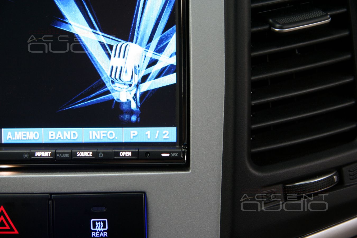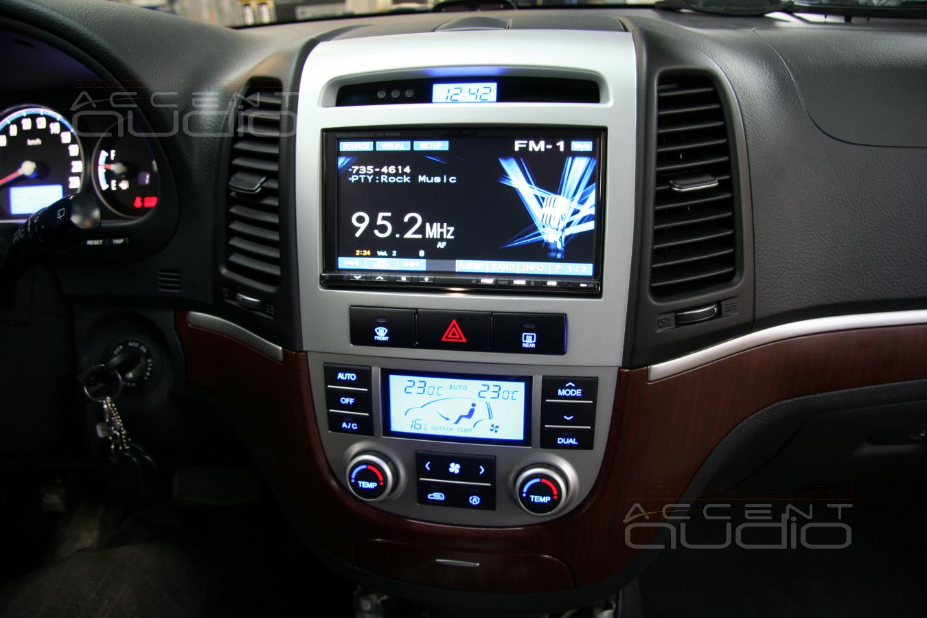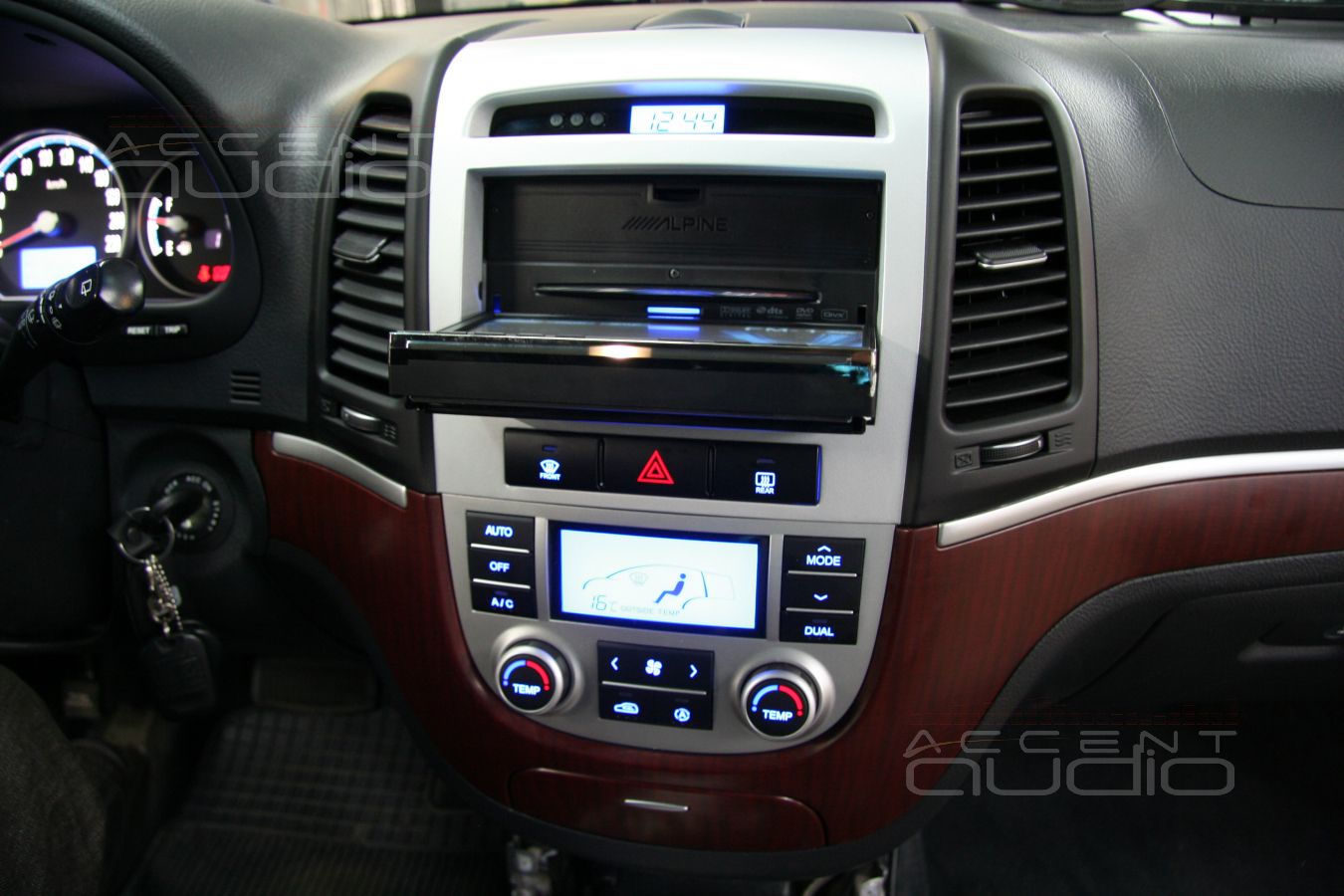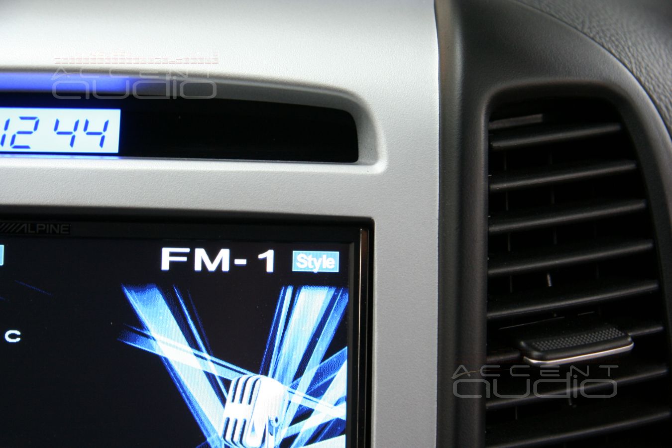 Штатная магнитола имеет свой, корейский форм-фактор и установить новое 2-дин головное устройство без переделок невозможно. На рынке существуют переходные рамки, но выглядят они не самым лучшим образом и после установки видно, что новое устройство инородно и доустановлено. Нашему клиенту это показалось неприемлемым, кроме того, владелец машины убежден, что верхняя часть консоли (там где часы), значительно логичнее выглядит серебристой, а не черной. Было решено переделать и перекрасить консоль. Для этого мы взяли рамку не от Alpine IVA-W502R, а от Alpine IVA-W202R, немного переделали ее и свели со штатной консолью, затем вывели под покраску и придали новый, вполне законченный вид.