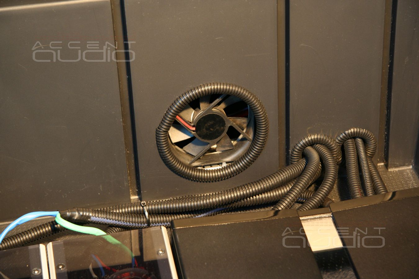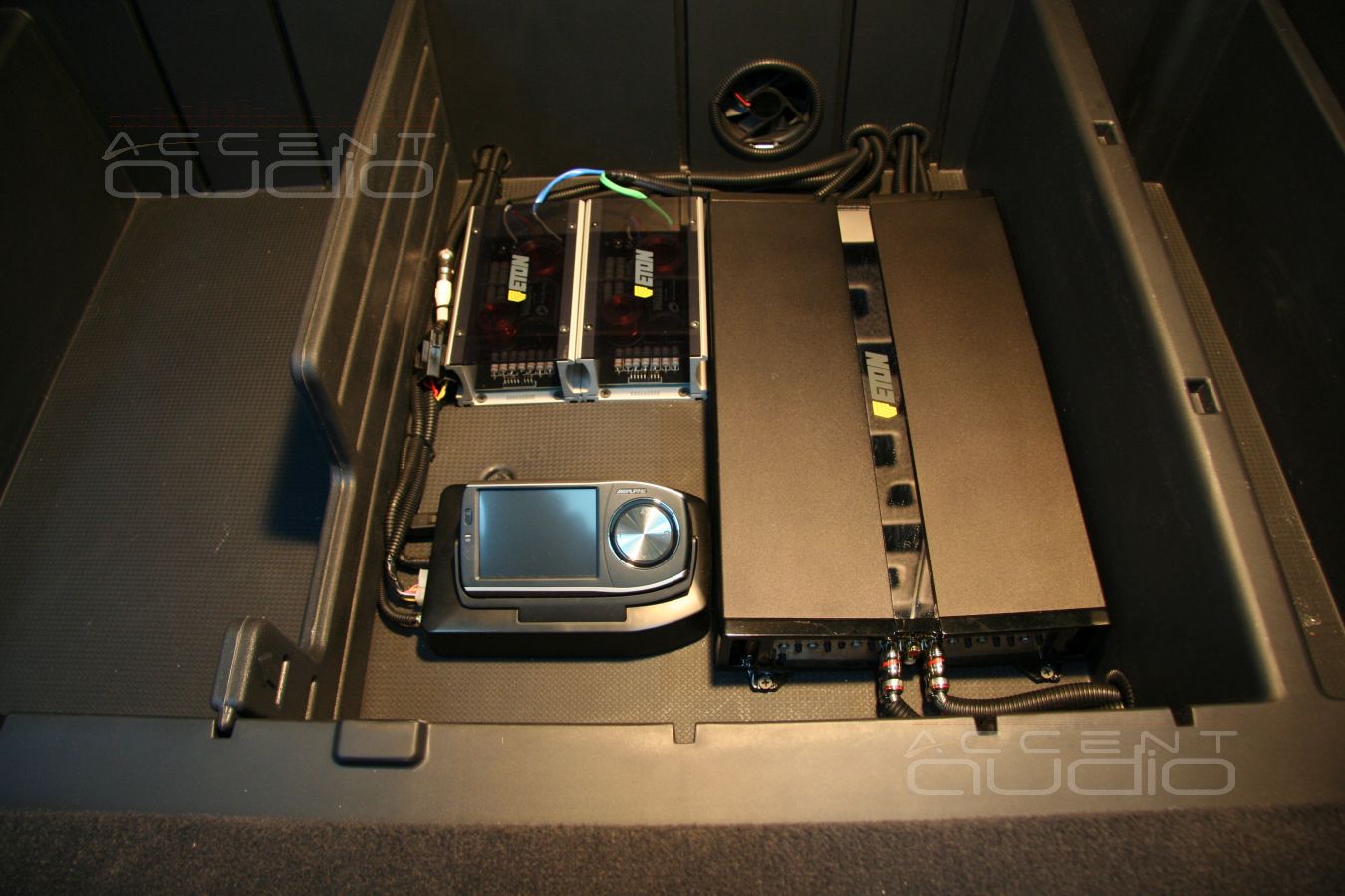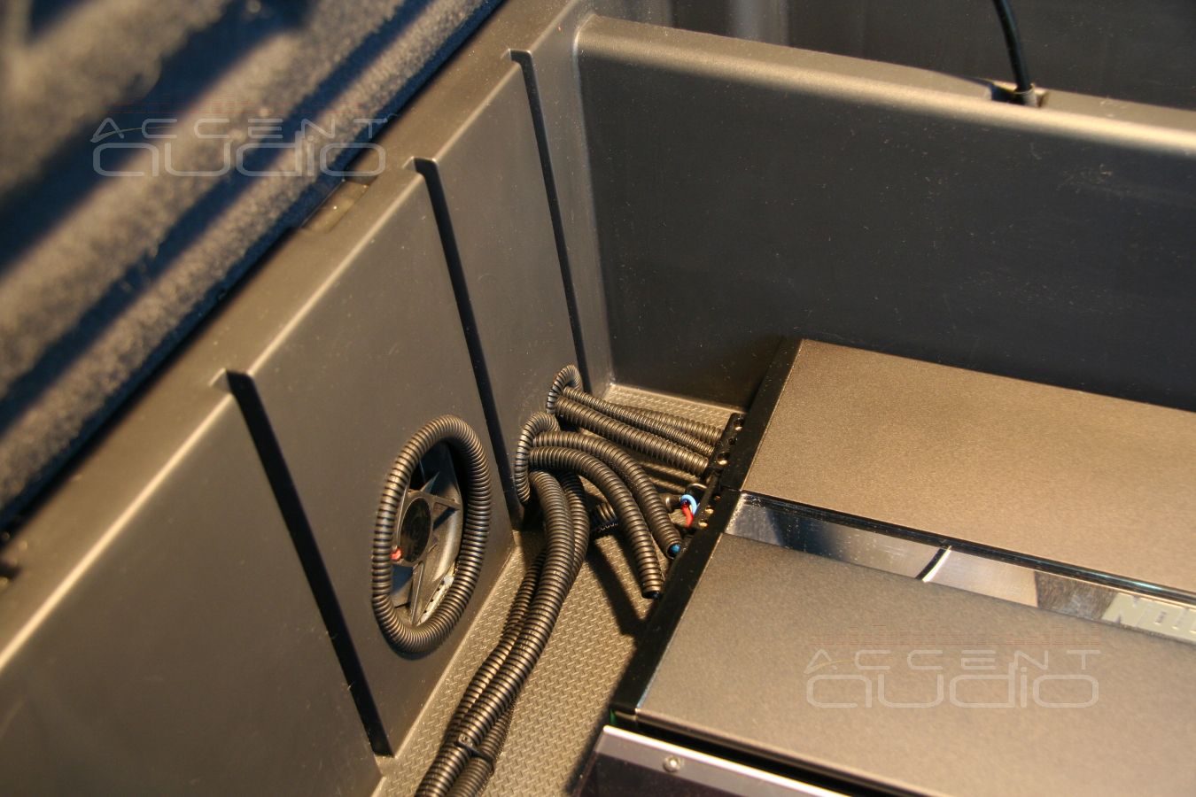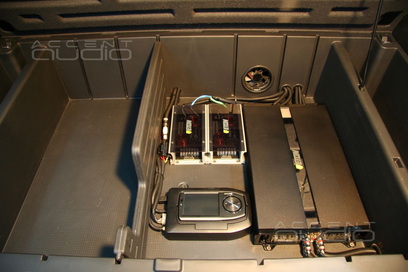 Усилитель, кроссоверы и блок навигации разместили в полу багажного отсека. Ящик в багажнике санты потрясающе удобен для подобных инсталляций. Чтобы все установленное, а в первую очередь усилитель не грелось, мы установили два вентлятора, один из которых затягивает воздух преимущественно из внутреннего пространства задних крыльев, а второй вытягивает под заднее сидение. Вся коммутация в гофрошлангах, все кабели закреплены, все проходы защищены.