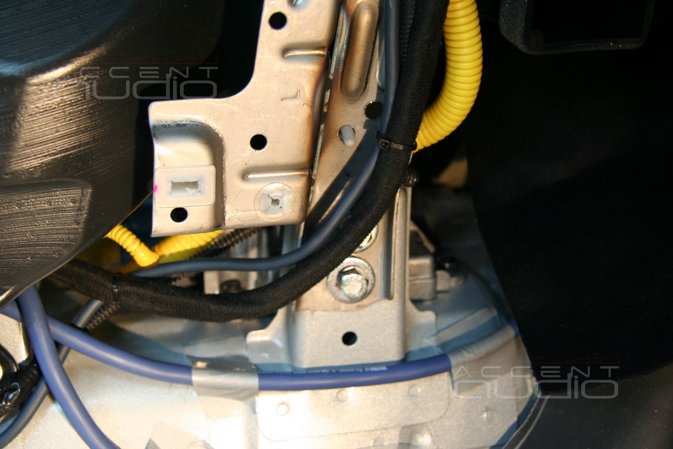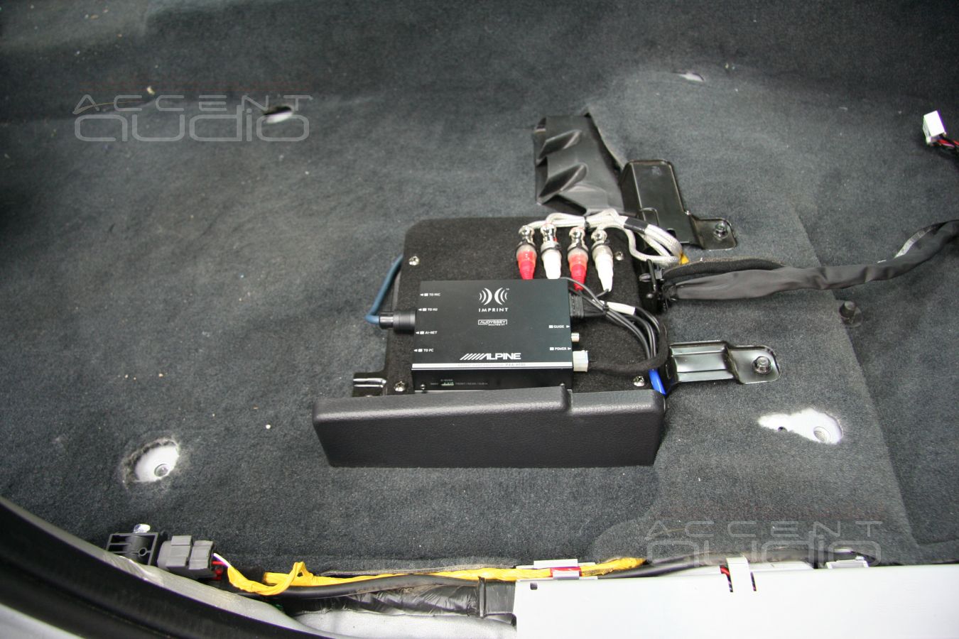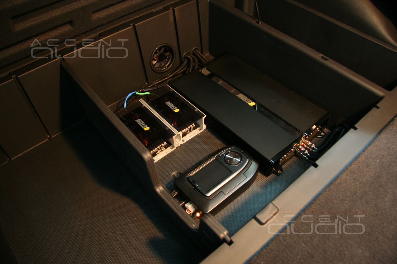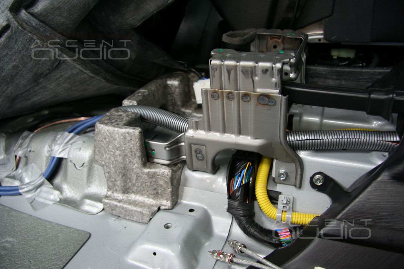 Предварительно, для удобства укладки проводки, было снято пассажирское сидение. Под ним мы обнаружили штатный усилитель. Выглядит он еще смешнее чем звучит и мы решили рагрузить машину от лишнего килограмма бесполезного железа. Место и крепления от снятого усилителя как раз пригодилось для установки процессора.