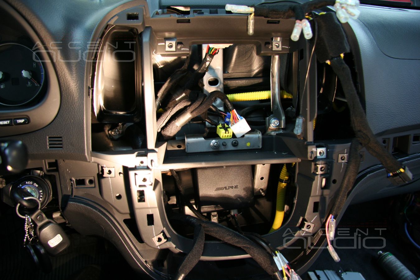Чтобы не резать штатную проводку и оставить ее в первозданном виде, мы взяли ответную чать-переходник, соединили с штатным хвостом Alpine, пропаяли и заизолировали все соединения, вывели дполнительные разъемы питания будущих устройств и все это обработали маделином, чтобы придать проводке заводской вид и исключить все возможные дребезги.