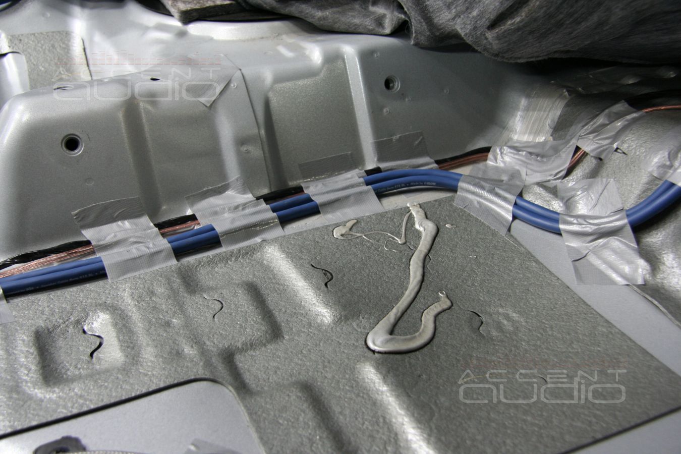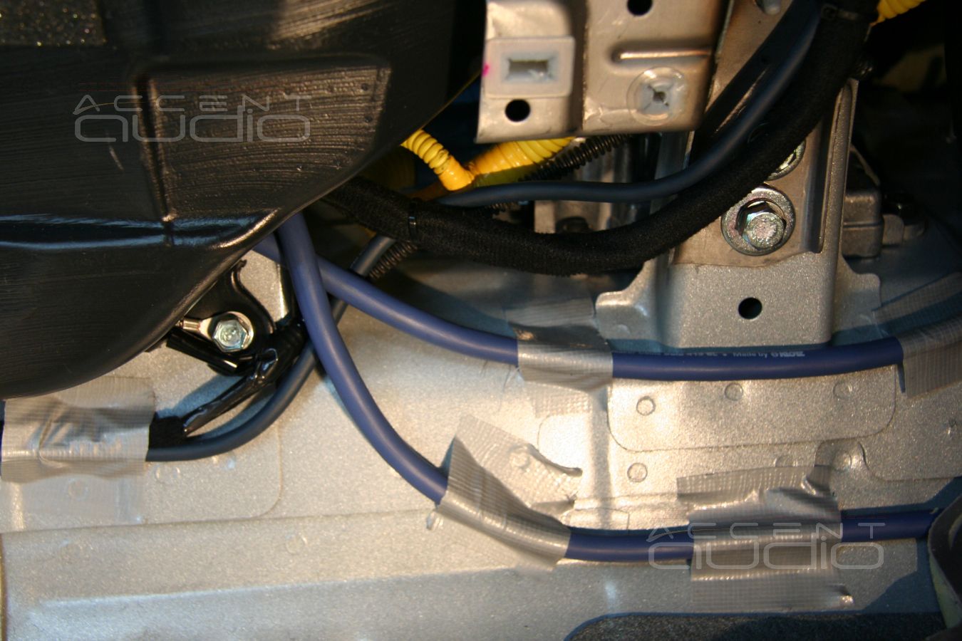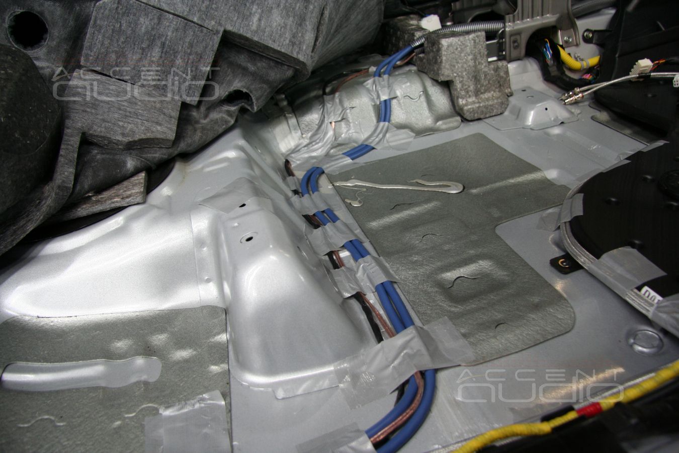 К процессу укладки проводов мы подошли с дополнительным уважением. Так как проводов много, пересекать друг с другом можно далеко не все, а пространство в консоли и под ковром совсем не безгранично, мы дополнительно закрепили все провода, чтобы при укладке ковра не образовалось горбов, а установленные сидения ничего не передавили.
