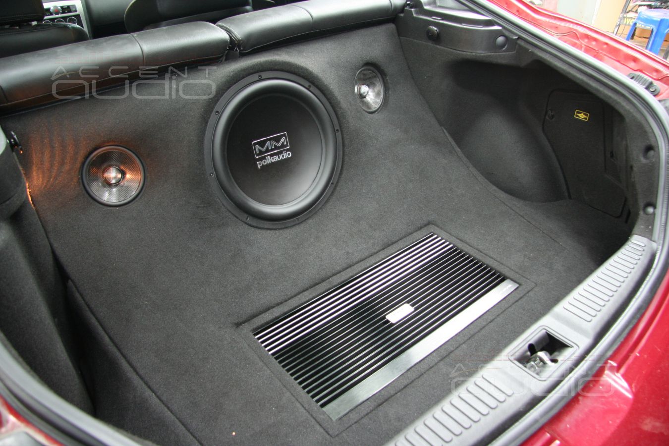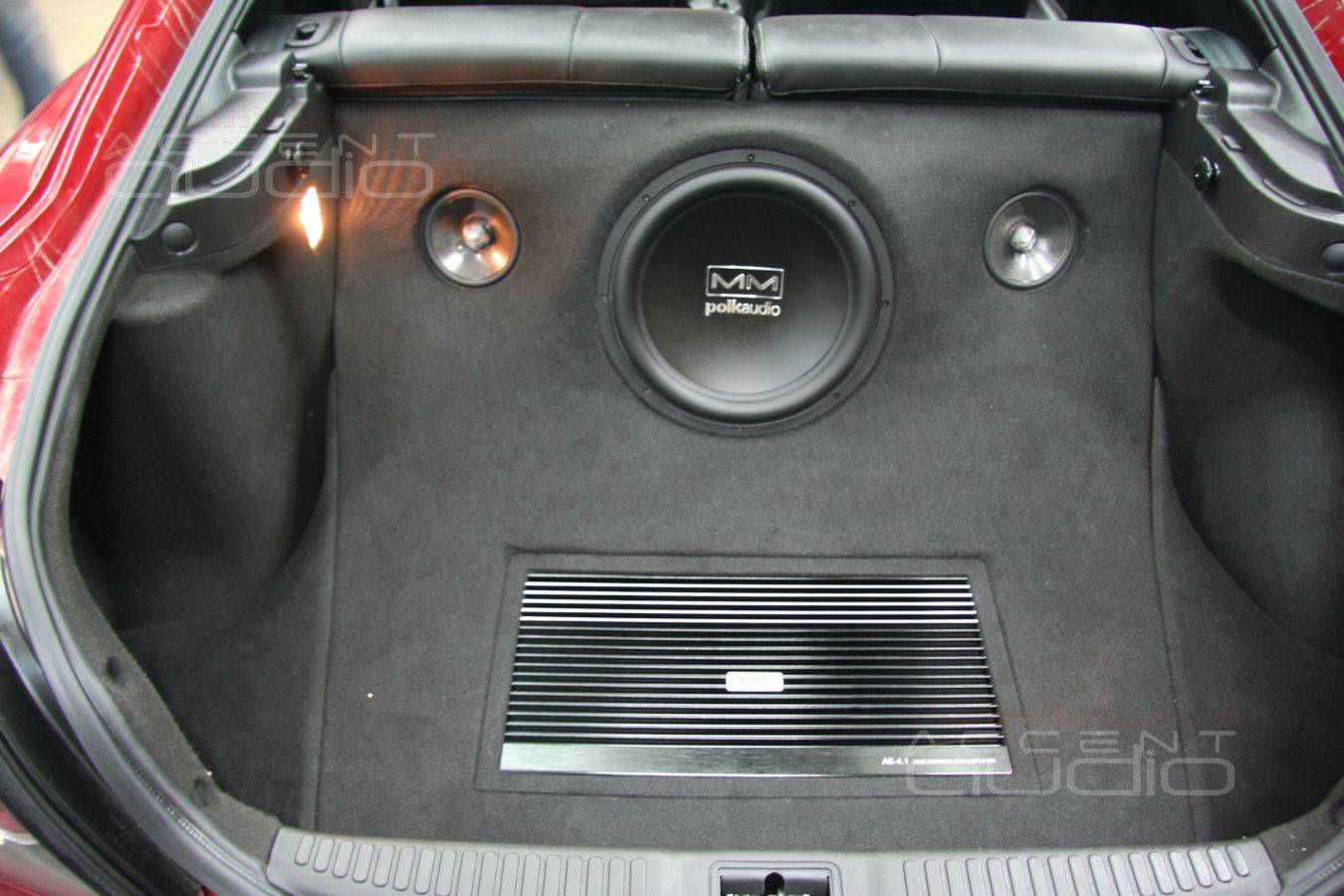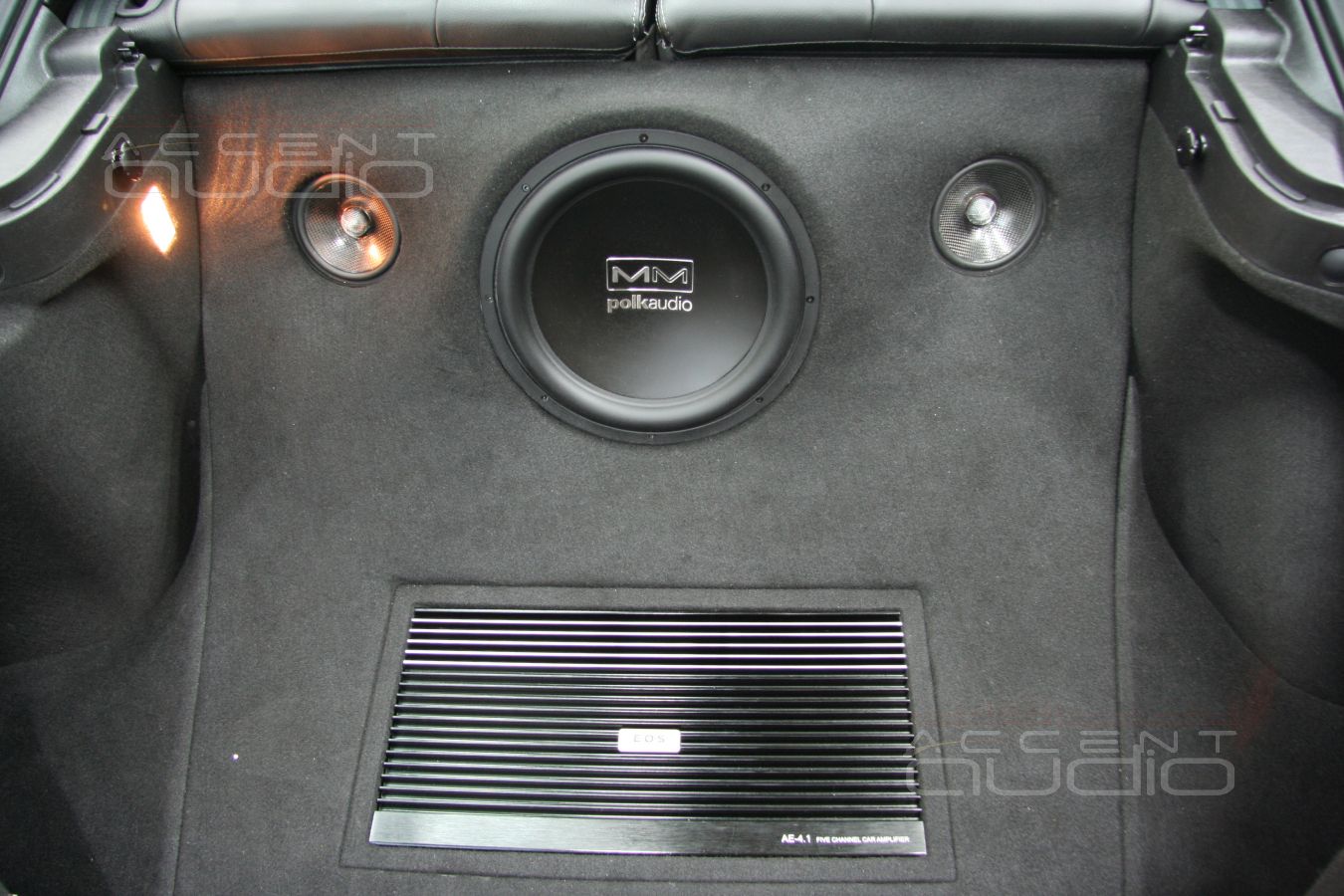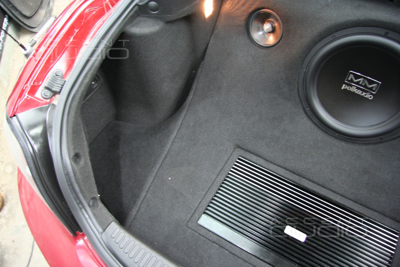 Конструкция в багажнике представляет собой герметичный ящик под сабвуфер из 22 мм фанеры, остальной, 12мм каркас, покрыт 5-ю слоями стеклоткани и полиэфирной смолы, что дает гарантию жесткости и прочности конструкции.