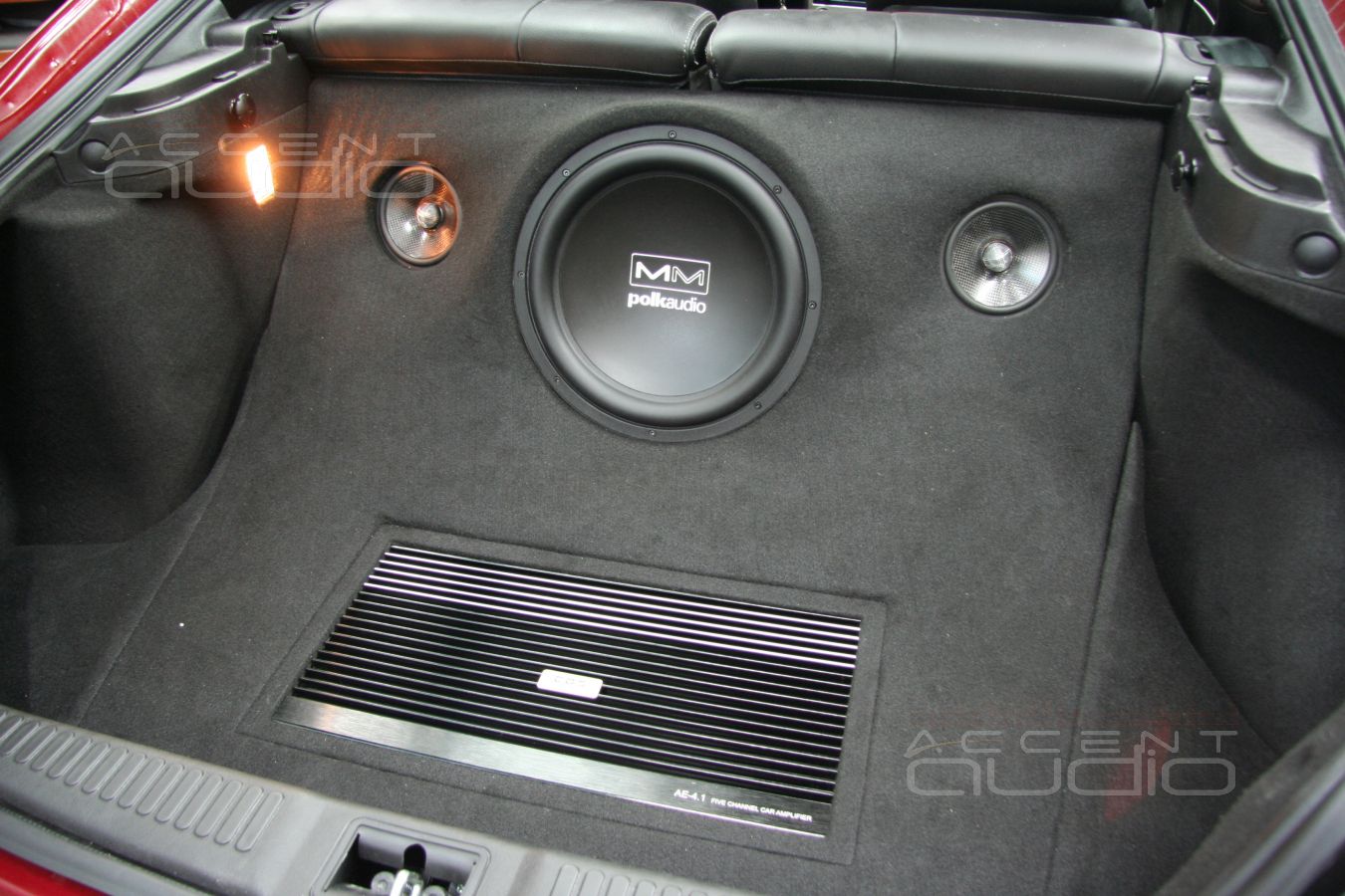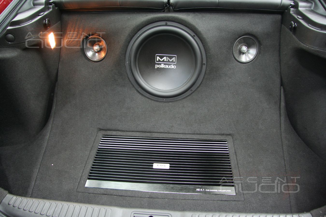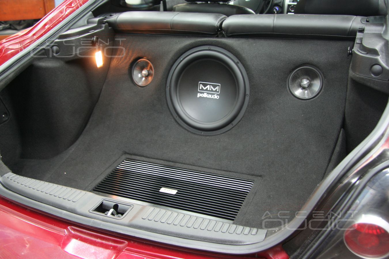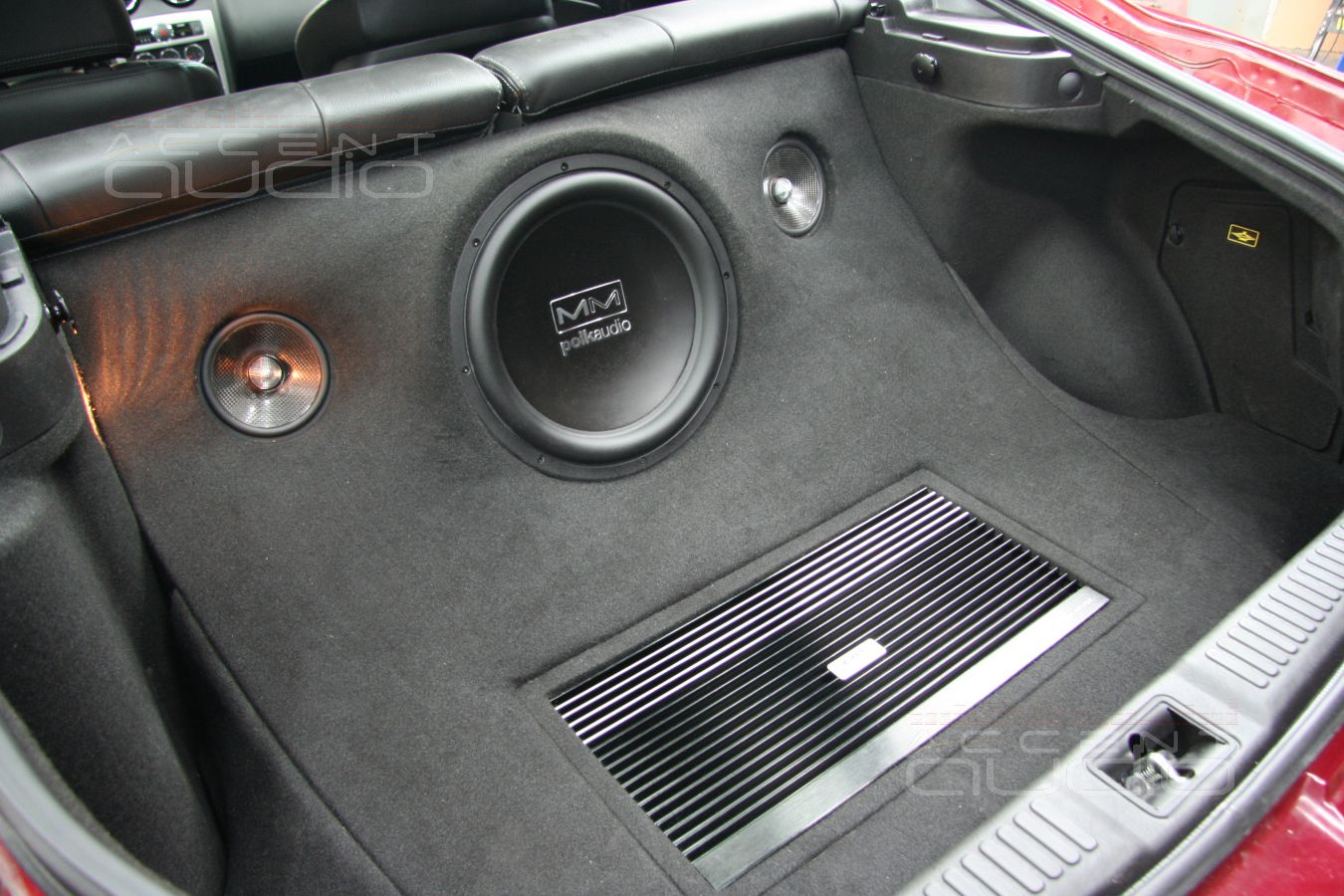 Конструкция в багажнике представляет собой герметичный ящик под сабвуфер из 22 мм фанеры, остальной, 12мм каркас, покрыт 5-ю слоями стеклоткани и полиэфирной смолы, что дает гарантию жесткости и прочности конструкции.