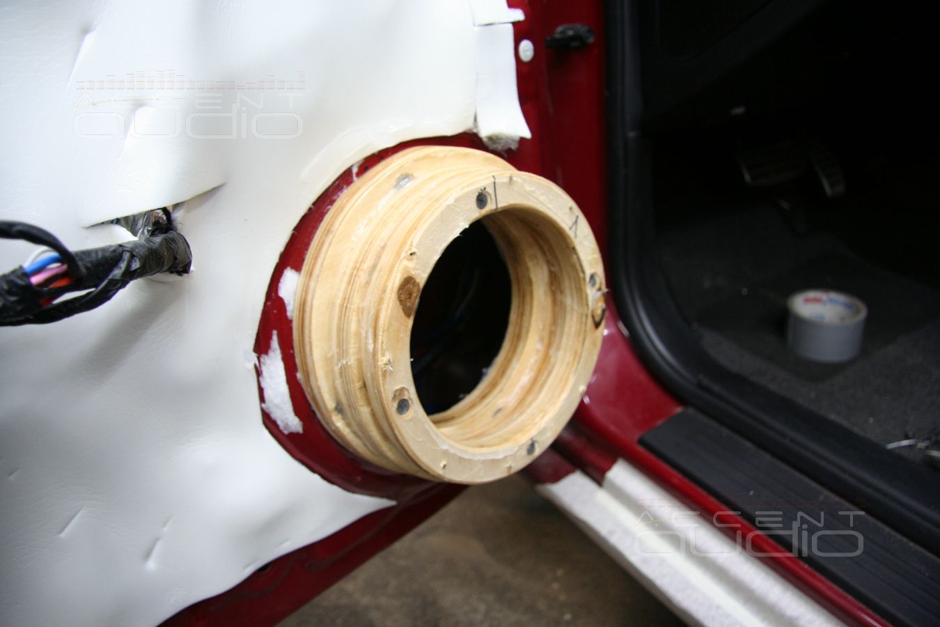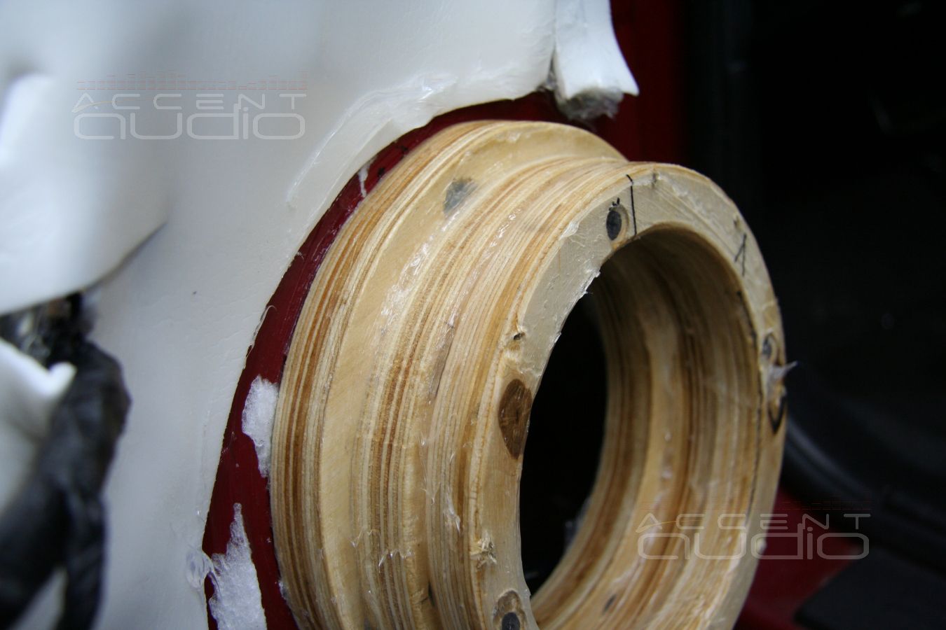При стандартных инсталляциях, мидбас устанавливается на проставочное деревянное кольцо и сверху надевается обшивка. В данном случае, под мидбас построен полноценный подиум из 4х колец, скрепленных между собой, загерметизированных и защищенных от влаги. Подиум полностью выдвигает мидбас из под обшивки, а уже сверху крепится накладной подиум с защитной сеткой, который намертво прижимает обшивку, исключает посторонние призвуки и позволяет мидбасу не играть "под обшивку".