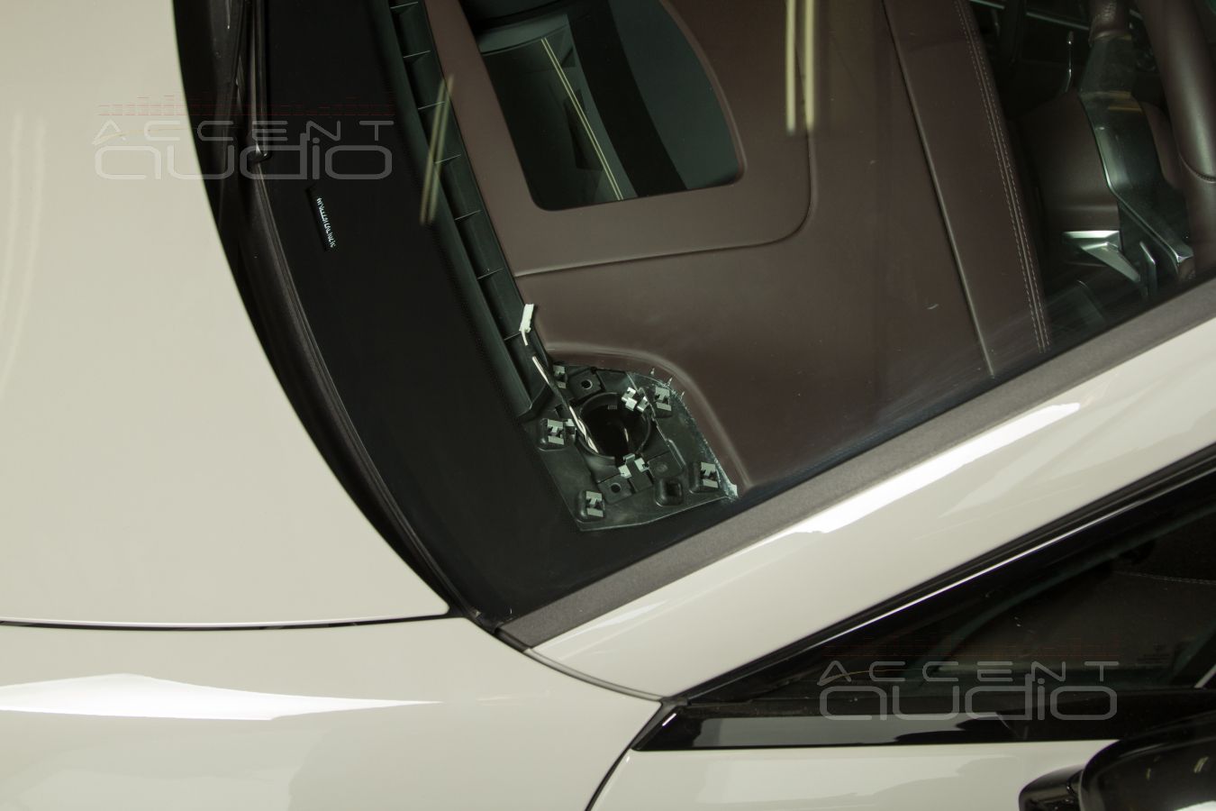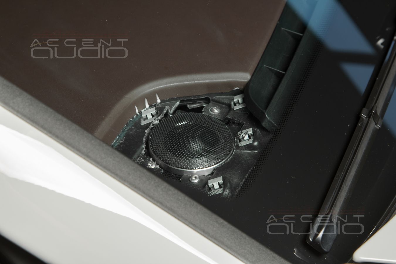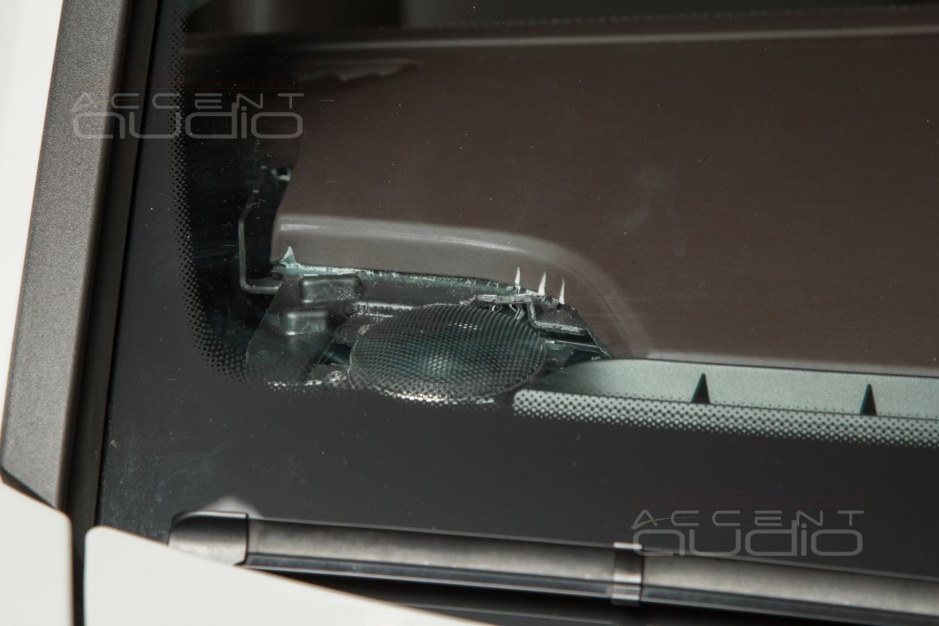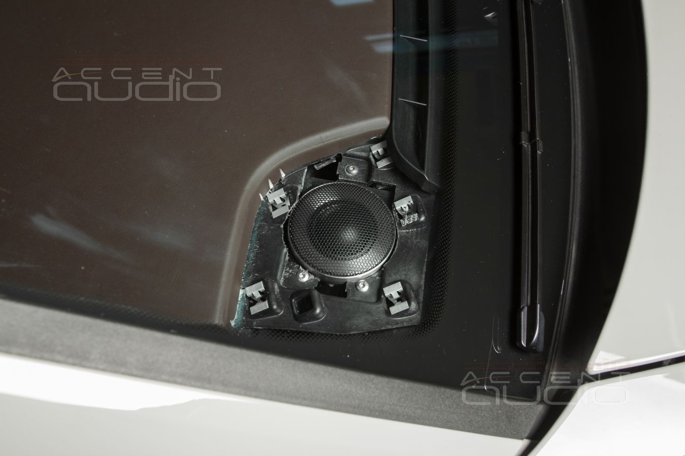Заказчик строго требовал сохранить идеально-штатный вид салона. Его можно понять. Наше настойчивое предложение установить твитеры в стеклянные треугольнички он отверг. Мы попытались, честно, настойчиво.