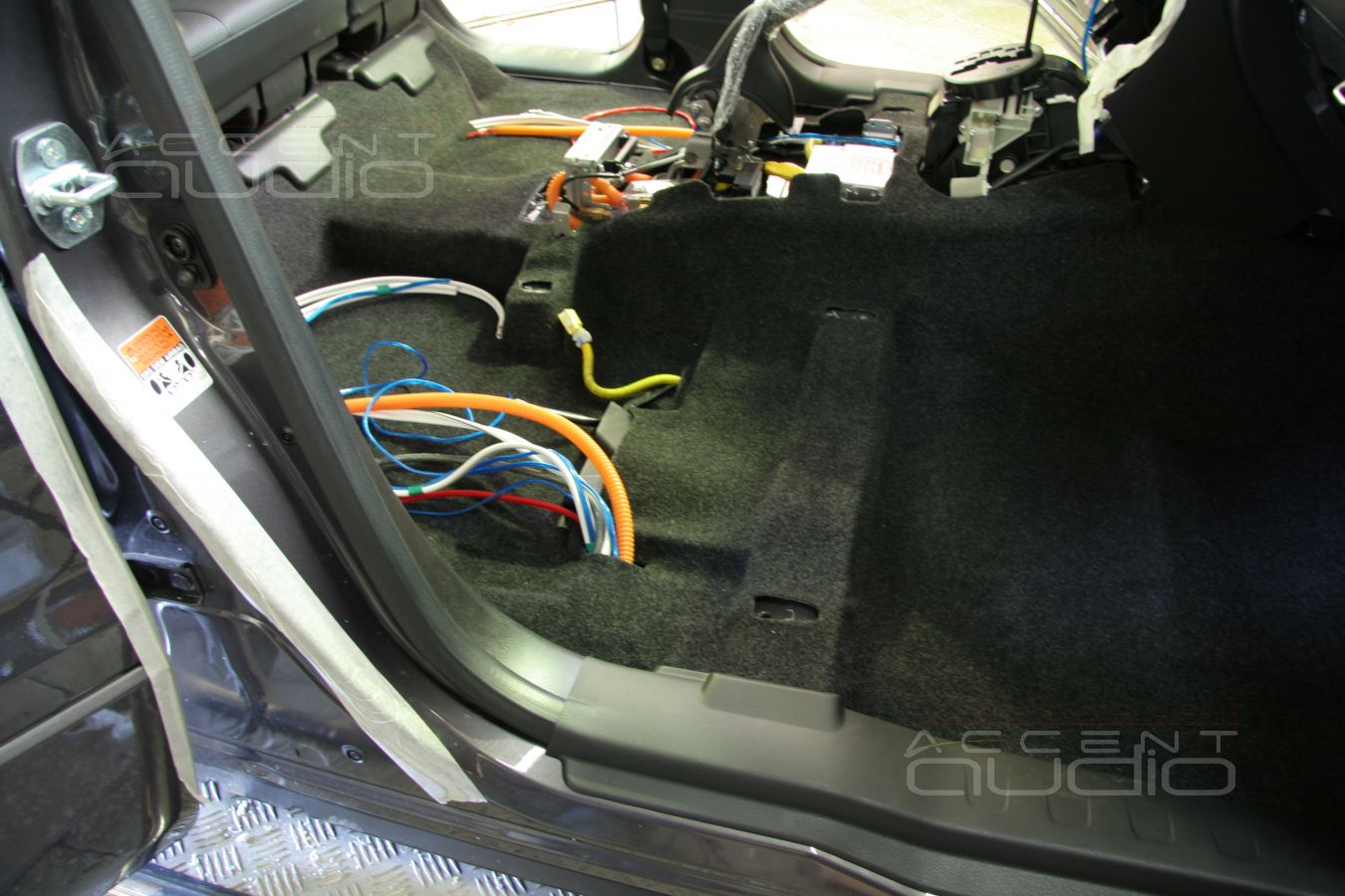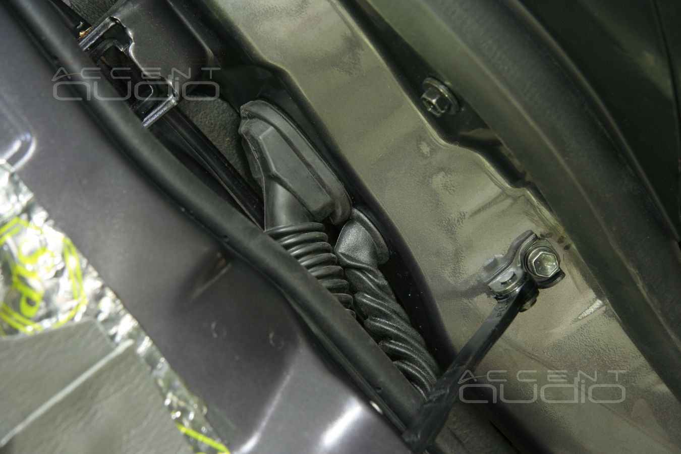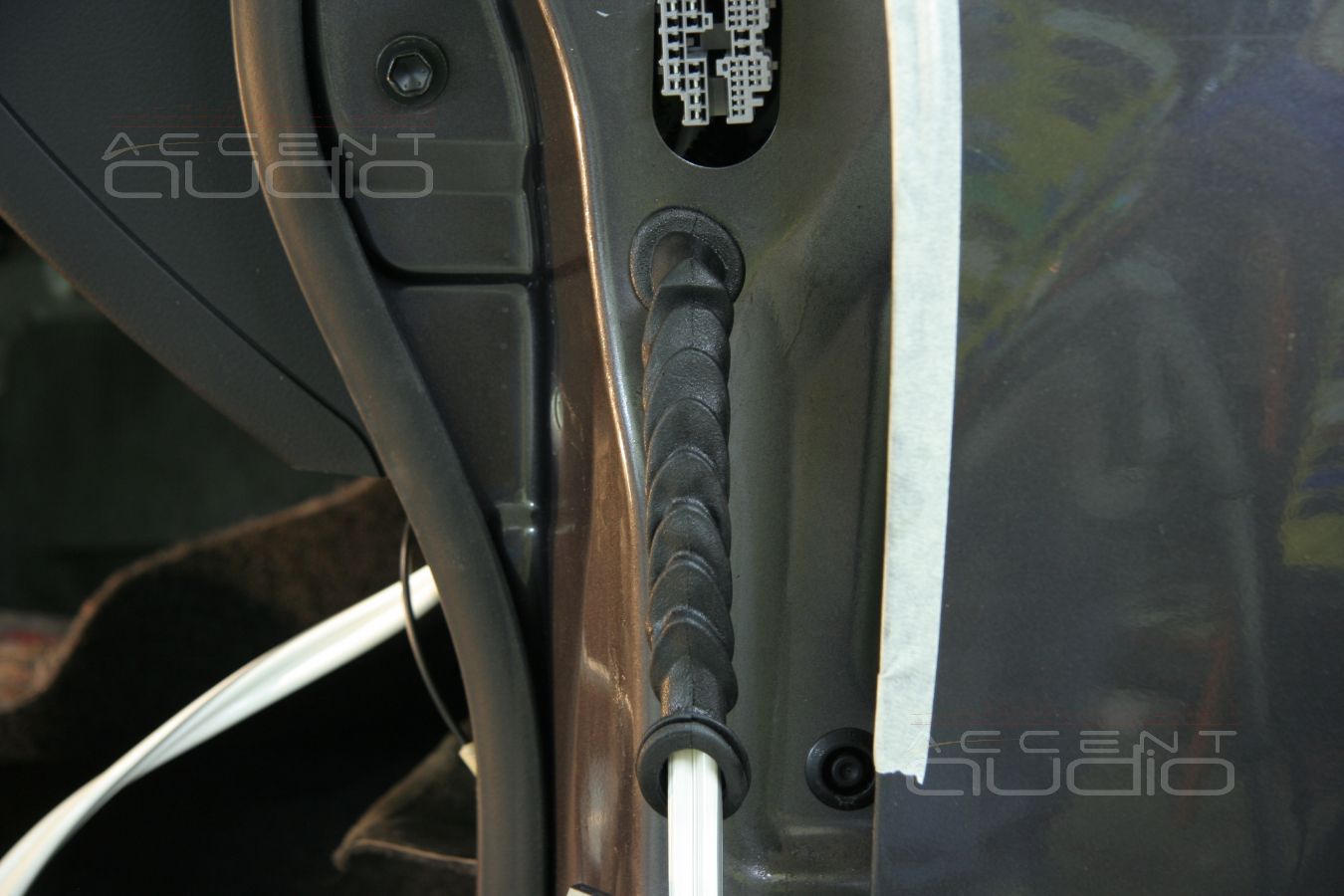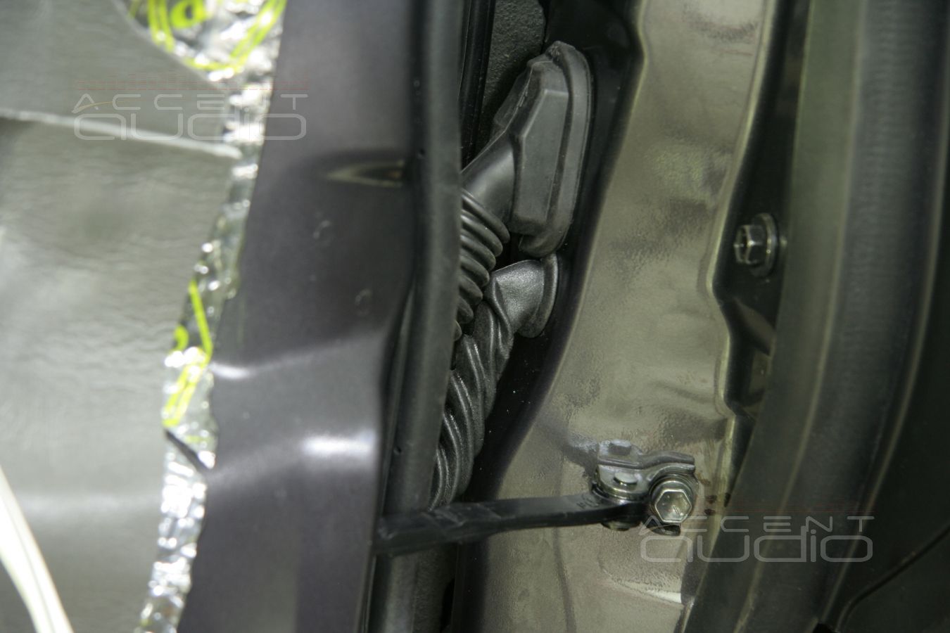 2. Протащить новые кабели в двери автомобиля не представляется возможным, т.к. штатный разъем полностью занят, поэтому были сняты двери, просверлены и обработаны новые отверстия в кузове и в дверях, установлен новый кабельный канал в виде штатной резиновой гофры.